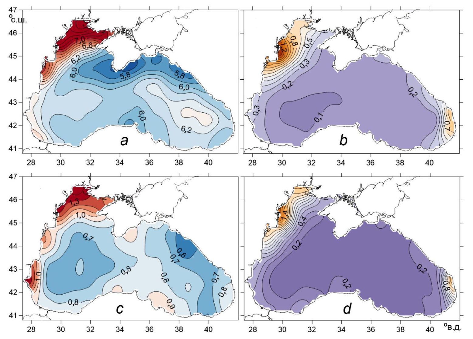 Насущная необходимость проведения более точных и обоснованных оценок современных региональных климатических изменений и сопоставления их с глобальными тенденциями стимулирует работы по определению характеристик всего диапазона временной изменчивости и созданию новых версий климатических полей. Увеличение количества наблюдений в Черном море за последнее десятилетие позволяет повысить пространственное разрешение климатических массивов, которые имеют широкую область применения. В частности, оценки климатических аномалий, полученные на их основе, важны не только в качестве традиционных климатологических характеристик, а также для решения новых актуальных задач, таких как формирование общих представлений о механизмах цикла углерода в Азово-Черноморском бассейне.