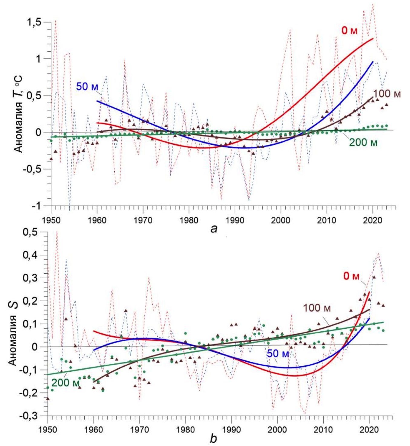 Fig. 6. Time-series of the Black Sea average annual anomalies relative to climatic seasonal variations at different depths for 1950–2023: water temperature (a) and salinity (b). Thin dashed lines and symbols show the anomaly values, thick lines – the polynomial approximation; individual depths are highlighted in different colors