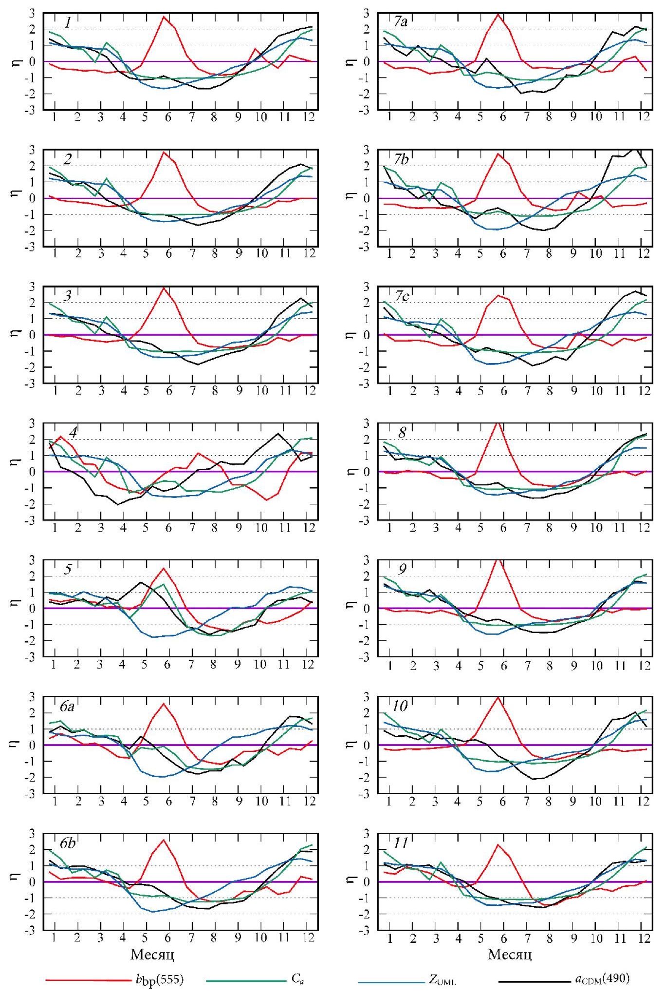 Нормализованные аномалии изменения всех параметров позволили выявить их внутригодовую цикличность (рис. 3). Максимум bbp(555) в июне наблюдается с высокой вероятностью (нормированная аномалия более 2) почти во всех районах моря. На северо-западном шельфе (район 4) максимум bbp(555) отмечается в разные месяцы на протяжении лета, что снижает статистическую вероятность его проявления (нормированная аномалия около 1) (рис. 3). В Черном море годовая динамика Ca характеризуется минимумом в летнее время, за исключением прибрежных вод, подверженных влиянию стока рек Дунай, Днепр и Днестр (районы 4, 5 и 6а), где летом прослеживается увеличение Ca (рис. 3).
