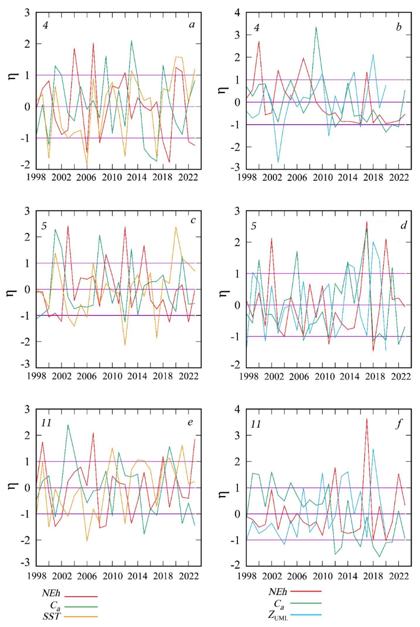 Рис. 4. Межгодовая изменчивость η нормализованных аномалий численности G. huxleyi (NEh), концентрации хлорофилла а (Ca), температуры поверхностного слоя моря (SST) и толщины верхнего квазиоднородного слоя моря (ZUML) в феврале (a, c, e), июне (d, f) и августе (b) в районах 4, 5 и 11