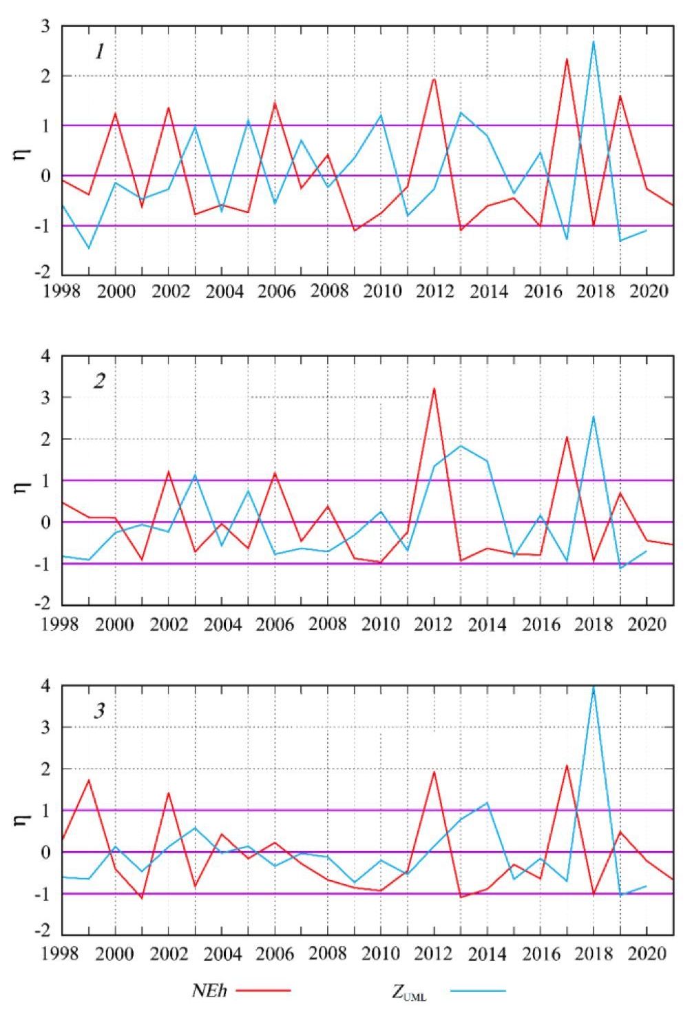 Fig. 5. Interannual variability η of normalized anomalies of G. huxleyi cell abundance (NEh) and thickness of the upper mixed layer (ZUML) in June in regions 1, 2 and 3 in the Black Sea