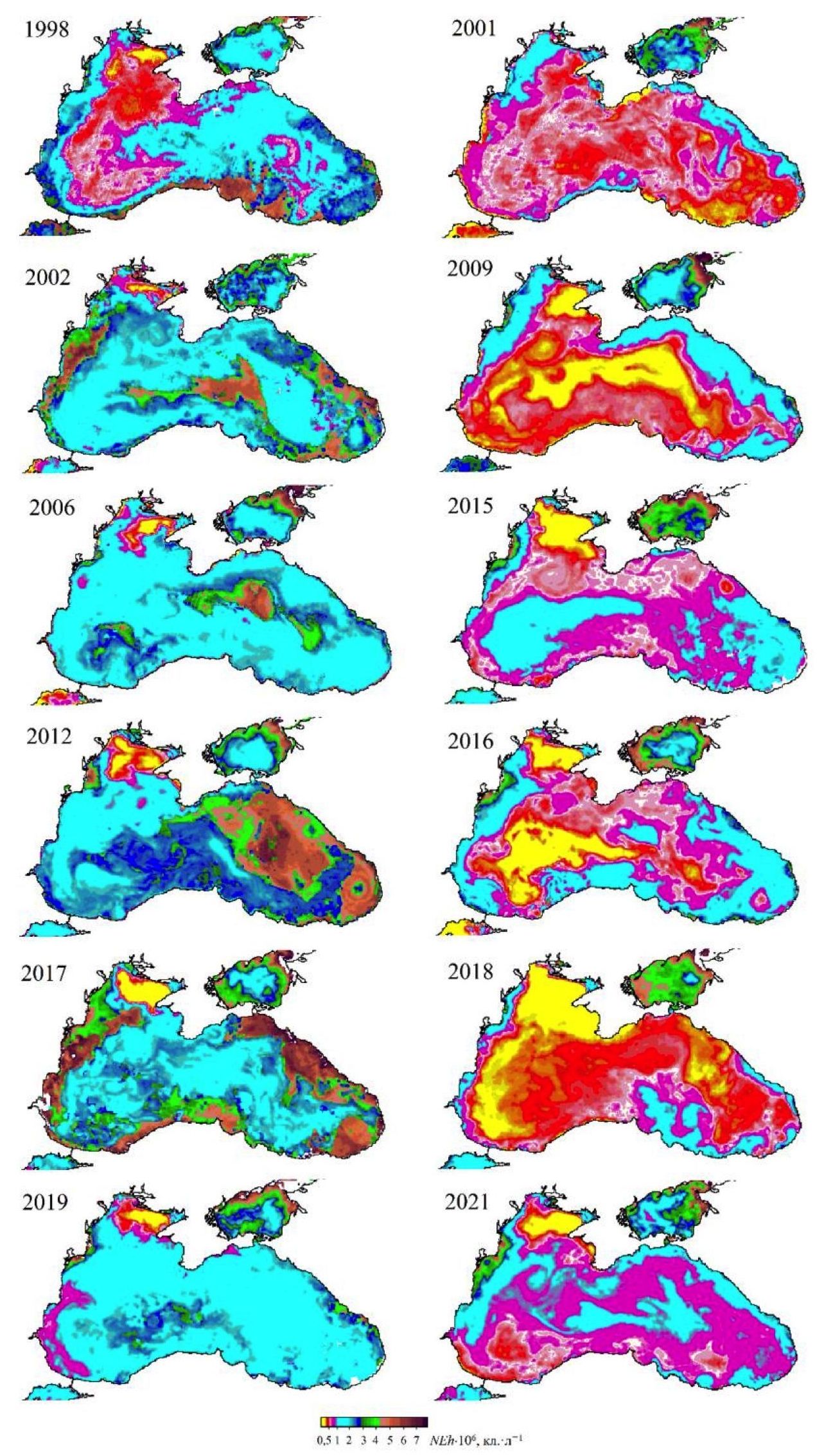Fig. 8. Maps of spatial distribution of G. huxleyi cell concentration (NEh) in the Black Sea surface layer: in the first half of June in 1998, 2002, 2005, 2006, 2012, 2017 (left), 2001, 2009, 2011, 2015, 2016, 2018, 2021 (right)