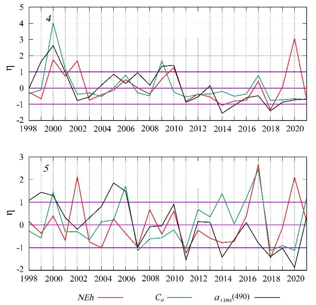 Рис. 10. Межгодовая изменчивость нормализованных аномалий интенсивности «цветения» Gephyrocapsa huxleyi (NEh), концентрации хлорофилла а (Ca) и показателя поглощения света неживым взвешенным и растворенным органическим веществом (aCDM(490)) в июне в районах 4 и 5 Черного моря
