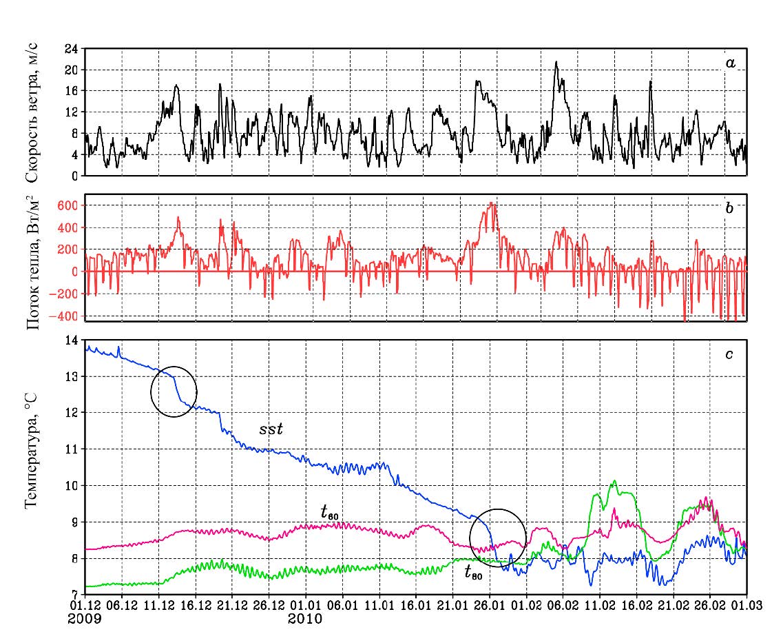 На рис. 1 показан временной ход температуры поверхности моря (ТПМ) итемпературы на глубинах 60 и 80 м, а также скорости приводного ветра исуммарного (явный + скрытый + коротковолновый + длинноволновый) потока тепла от поверхности. Видно (рис. 1, c), что в течение первых двух месяцев сезонного зимнего охлаждения поверхностная температура почти монотонно уменьшалась от 14°C до минимального значения ~ 8°C. На графиках температуры также видны инерционные колебания с периодом ~ 17 ч.