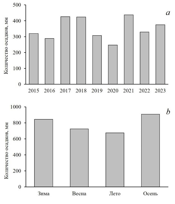 Рис. 3. Суммарное межгодовое (а) и сезонное (b) распределение количества осадков в г. Севастополе в период исследования