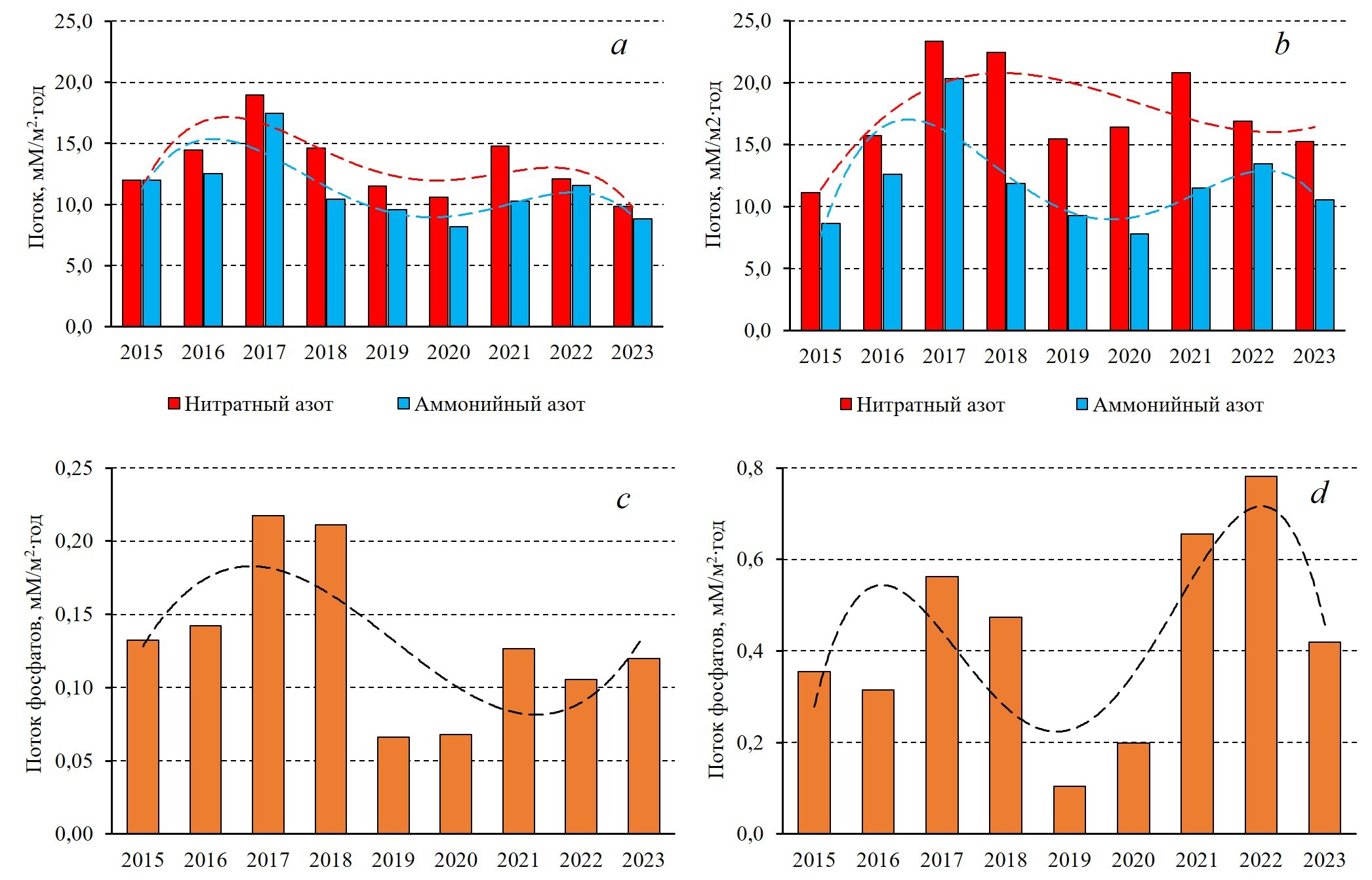 Выводы. Многолетнее изменение потока неорганического азота имеет квазипериодический характер с максимумом поступления в 2017 г. и минимумом – в 2019–2020 гг. Максимальный поток фосфатов для проб из закрытого осадкосборника наблюдался в 2017–2018 гг., в то время как поток для проб из открытого осадкосборника в 2021–2022 гг. превосходил поток в 2017–2018 гг. в 1,5 раза. Годовой вклад атмосферных выпадений составил 9,4–11,5 % от речного стока для азота и 16,7–55,6 % – для фосфатов, в меженный период – 12–14 и 20–65 % соответственно.