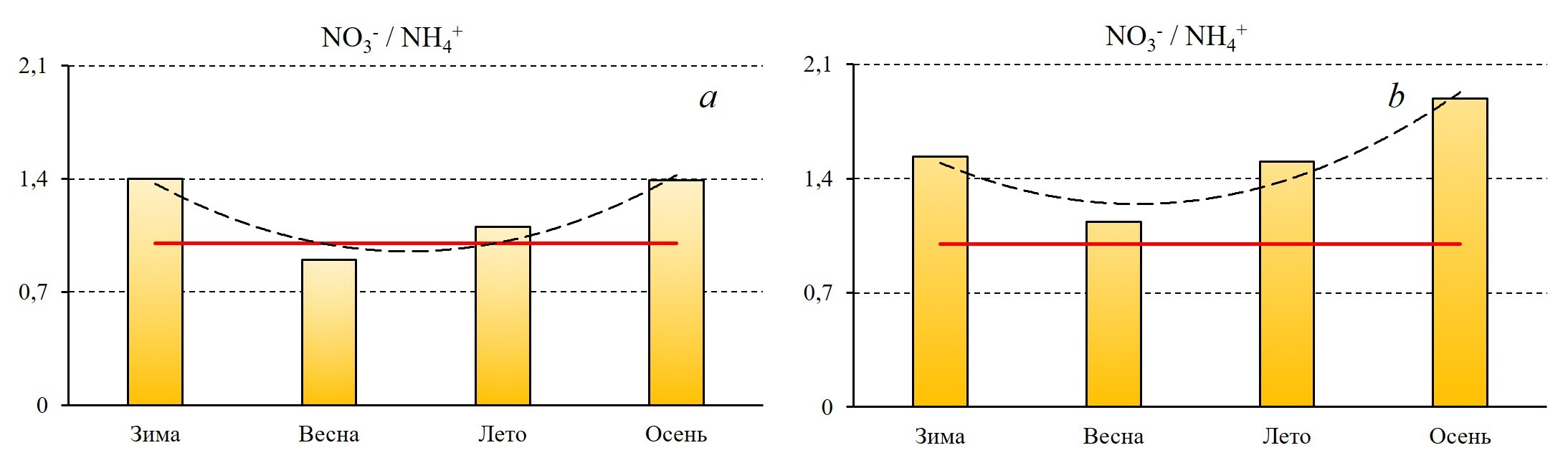 Рис. 5. Сезонное изменение соотношения минеральных форм азота в г. Севастополе в пробах из закрытого (a) и открытого (b) осадкосборников. Красной линией показано соотношение, равное 1, штриховыми – линии тренда