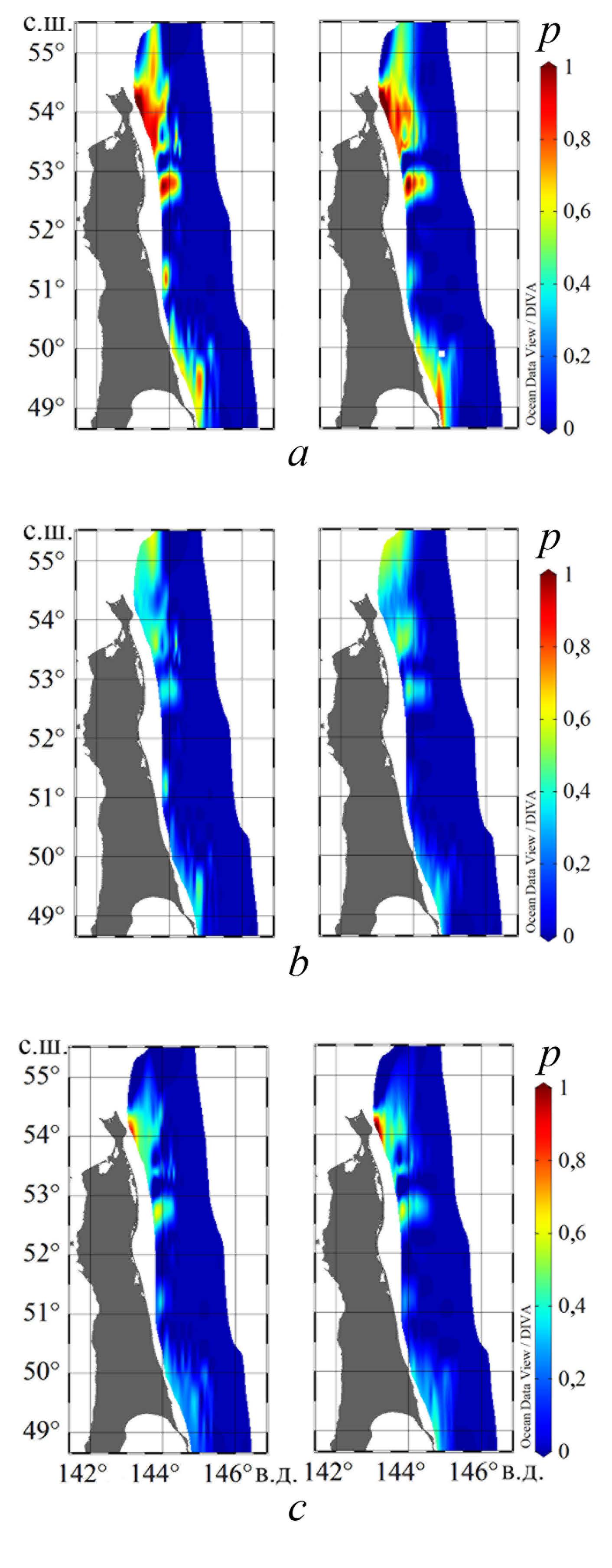 На рис. 6 представлены карты уровней вероятности превышения для придонной и приповерхностной скорости 0,3 м/c. При сравнении рис. 5 и рис. 6 видно, что расположение максимумов совпадает, но вероятности меньше, что особенно заметно для областей, находящихся южнее залива Чайво.