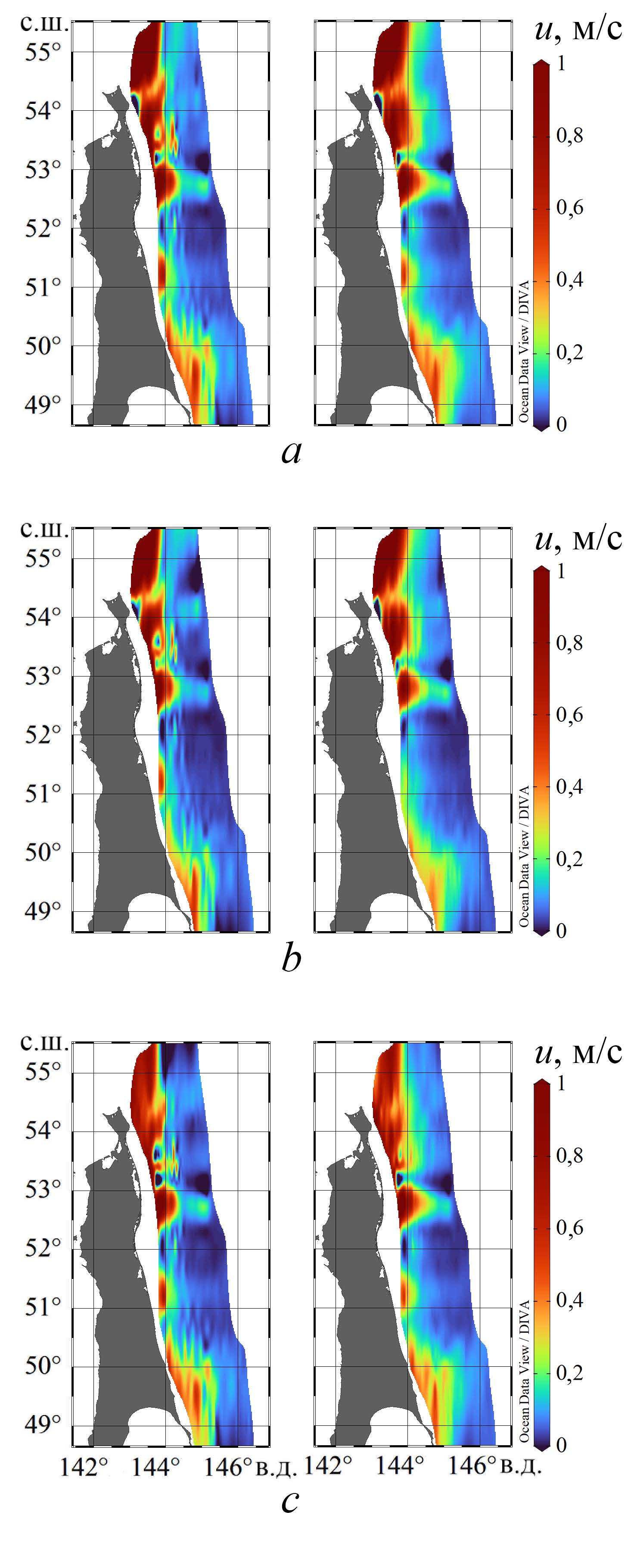 Рис. 7. Карты распределения значений придонной (15 м над уровнем дна, слева) и приповерхностной (15 м от поверхности, справа) скоростей по абсолютному значению (а), в направлении к берегу (b) и от берега (c), которые будут превышены с вероятностью 0,05