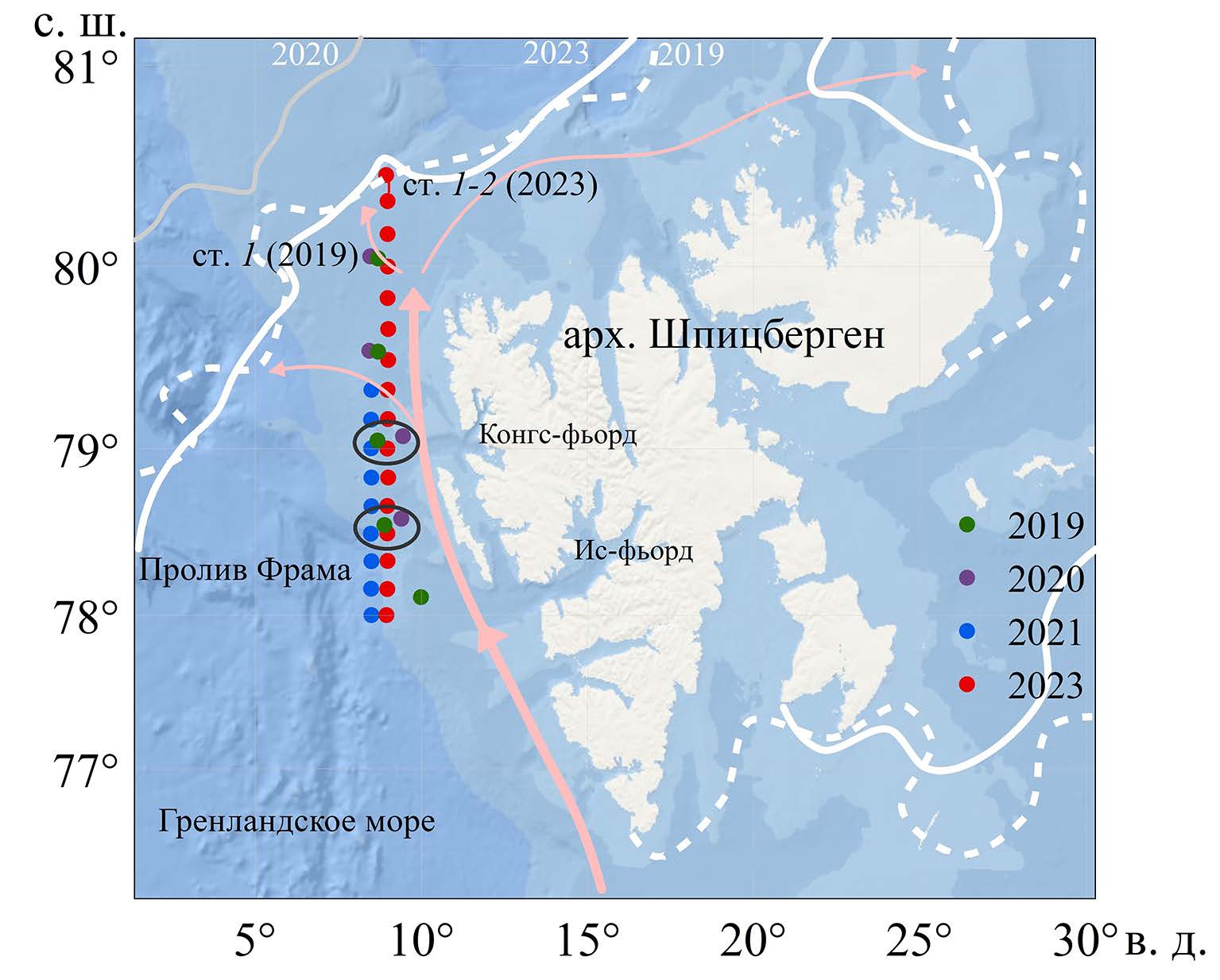Fig.1. Map of research area. Position of CTD sensing stations are shown by colored dots, areas of monitoring points – by black ellipses, position of currents – by pink arrows, position of ice edge in 2019 and 2023 – by solid and dashed white lines, and position of ice edge in 2020 – by solid gray line