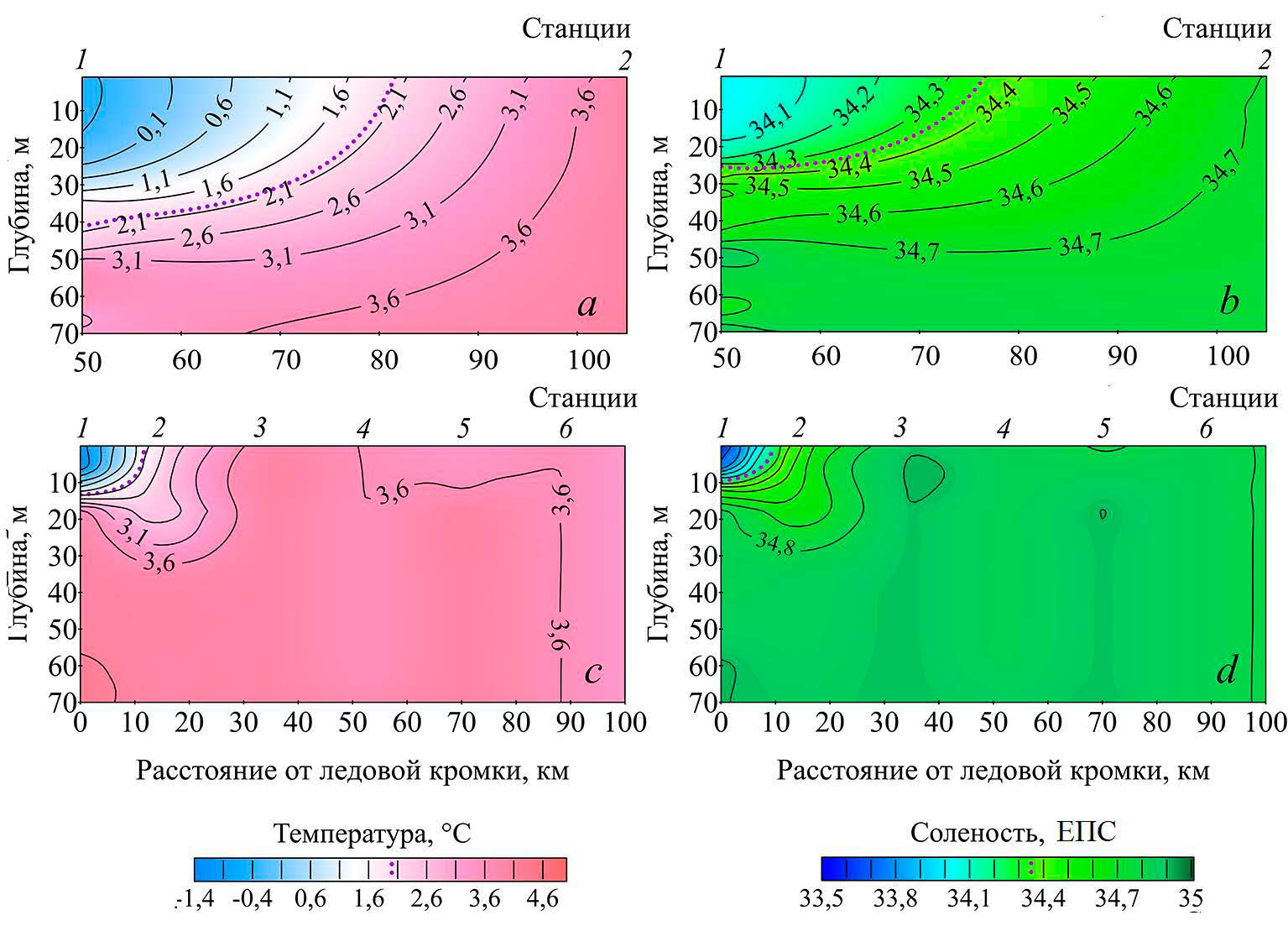 Фронтальный раздел в 2019 г. находился в 80 км от ледовой кромки, ПрФЗ наблюдалась в верхнем 30-метровом слое вод. В 2023 г. фронтальный раздел был зафиксирован на расстоянии 10 км от кромки льда, а ПрФЗ занимала верхний 10-метровый слой. Также более высокие градиенты температуры (0,08–0,24 °С/км) на разрезе в 2023 г. относительно 2019 г. были обусловлены возросшей аномалией температуры Западно-Шпицбергенского течения.