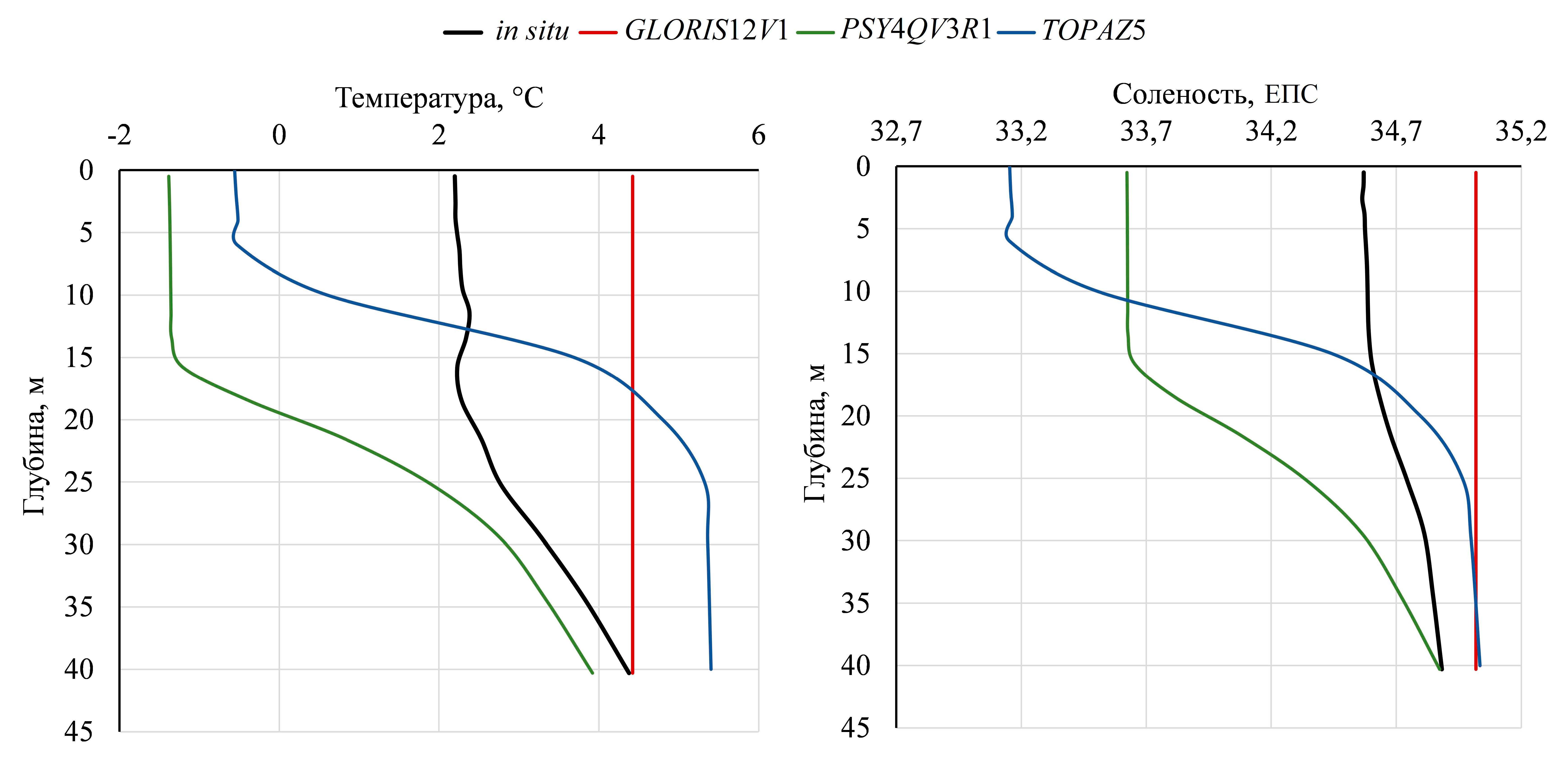 Сравнение данных измерений in situ с данными продуктов MERCATOR PSY4QV3R1, CMEMS GLORYS12v1 и TOPAZ5 показало, что все три реанализа имеют хорошую согласованность значений температуры и солености в водах Западно-Шпицбергенского течения, а распресненные охлажденные арктические воды и фронтальная зона между ними (арктическими и атлантическими) воспроизводятся плохо.