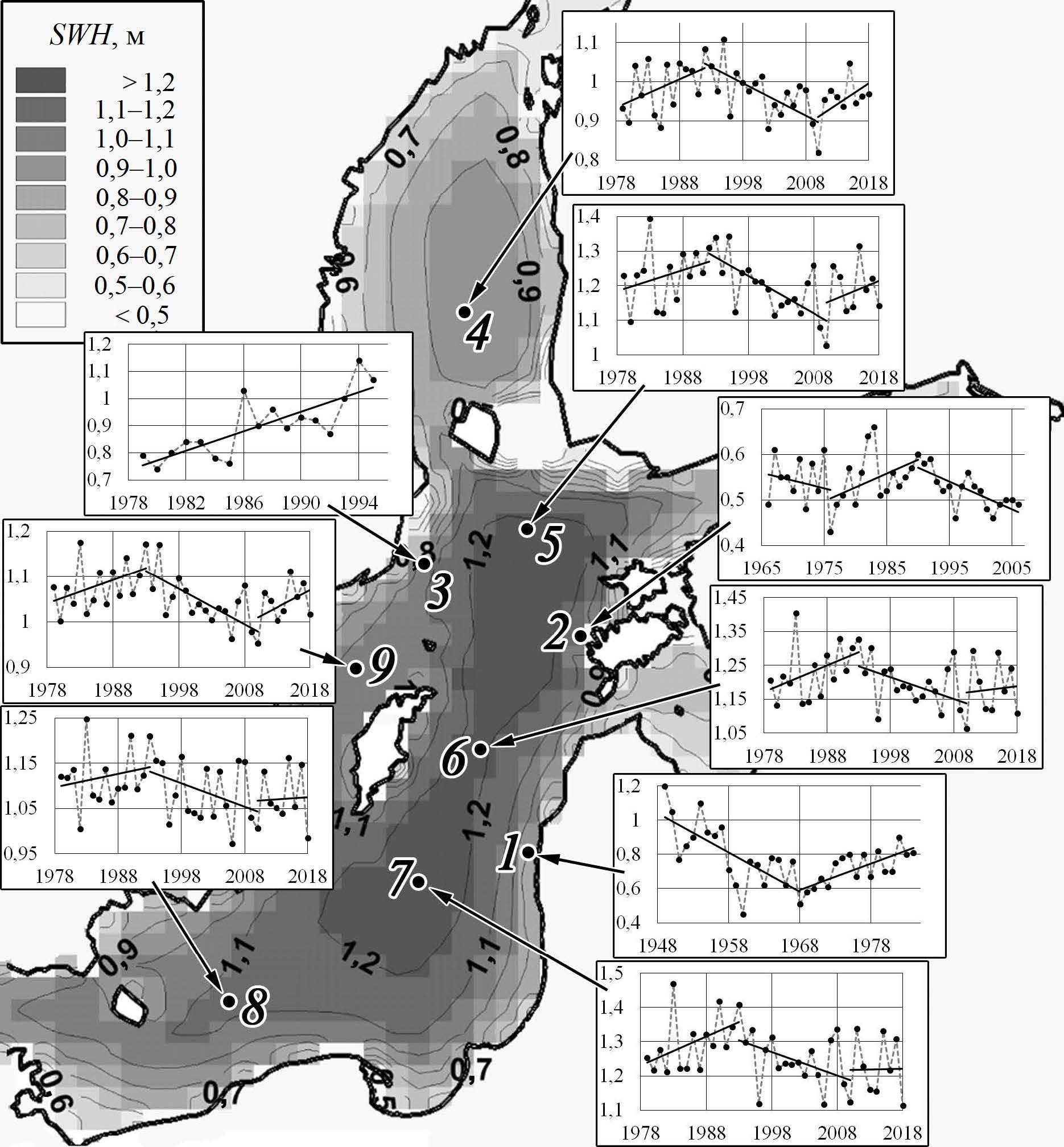 Данные, использованные для анализа. Рассмотрим динамику высот волн в Балтийском море. Расположение точек и временные серии среднегодовых SWH, использованные для анализа, показаны на рис. 1. Градации серого отражают информацию о пространственном распределении средних SWH (за период 1979–2018 гг.). Данные о временных сериях среднегодовых SWH в точках 1, 2 и 3 взяты из литературных источников [1, 5, 6], в точках 4–9 – являются результатами, полученными авторами. Рассмотрим более подробно методику получения данных для каждой из представленных на рис. 1 точек.