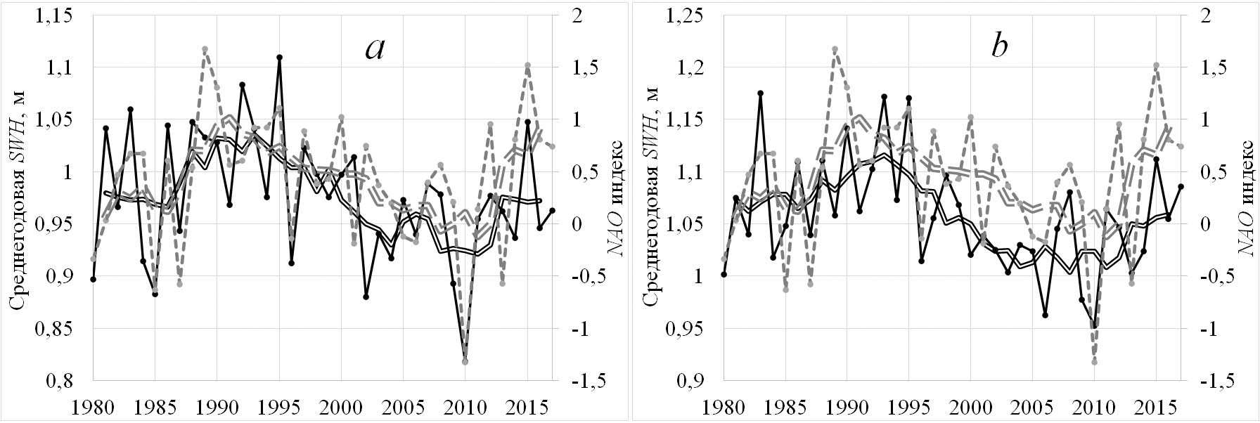 Рис. 2. Осредненные среднегодовые SWH и индекс NAO с января по март (JFM) за период 1980–2017 гг. в точках 4 (a) и 9 (b). SWH: среднегодовые значения – тонкая сплошная линия, скользящее пятилетнее среднее – двойная сплошная линия; индекс NAO (JFM): ежегодный – штриховая линия, скользящее пятилетнее среднее – двойная штриховая линия
