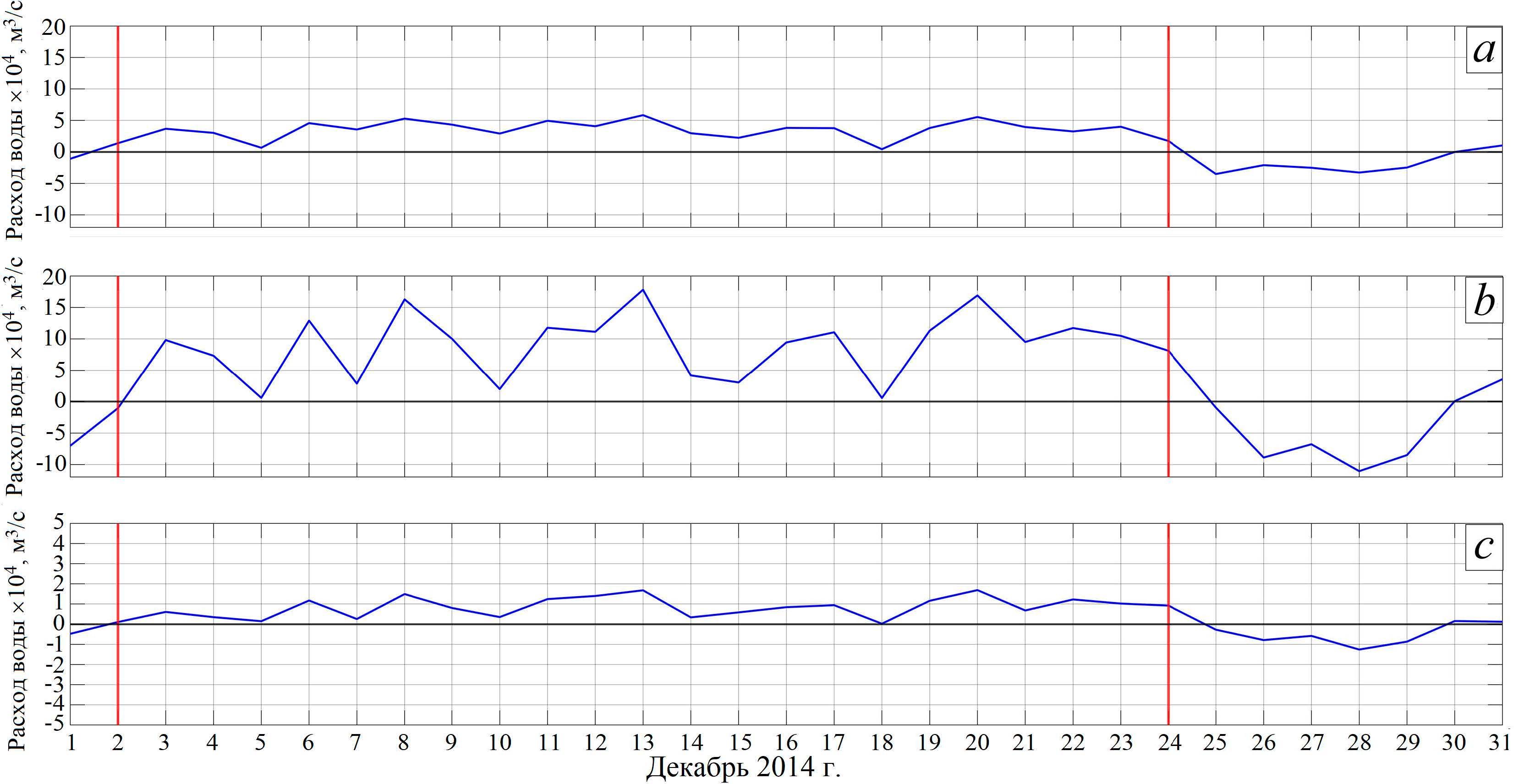 где n – количество ячеек i на разрезе; m – количество горизонтов z в данной ячейке; – меридиональная составляющая скорости течения в ячейке сетки на горизонте z; – площадь сечения ячейки, которая определялась как произведение толщины слоя () на расстояние между соседними узлами сеточной области модели (), т. е. S=.