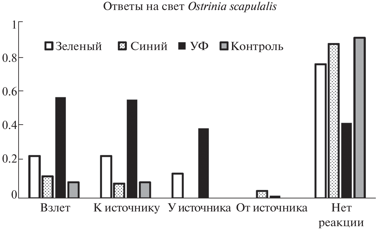 The attraction of nocturnal insects to light is a known phenomenon with unknown physiological mechanisms. Moths of the pyralid family are characterized by the most pronounced response to light, but the spectral preferences of these insects have not been studied. The adzuki been borers Ostrinia scapulalis, which live on dicotyledonous plants, are the ancestral form for the Asian and European corn borers, widespread pests of corn. Using a wind tunnel modified to deliver light stimuli, we tested the responses of males and females to light stimuli with wavelengths of 532, 440 and 365 nm at 2 lux, capable of stimulating photoreceptors of compound eyes (with maximum sensitivity of 352, 413, 480 and 530 nm) as well as simple ocelli, whose sensitivity had the main peak in ultraviolet and additional one in the green spectrum (360 and 520 nm). It turned out that ultraviolet was the most attractive stimulus. A small percentage of insects responded to green light, but showed a freezing reaction near the light source. The least attractive was blue light, which also caused freezes. Thus, the flight of O. scapulalis adults is induced by short-wavelength light, the response is more consistent with the sensitivity of the ocelli than the compound eyes; blue and green light leads to a masking effect.