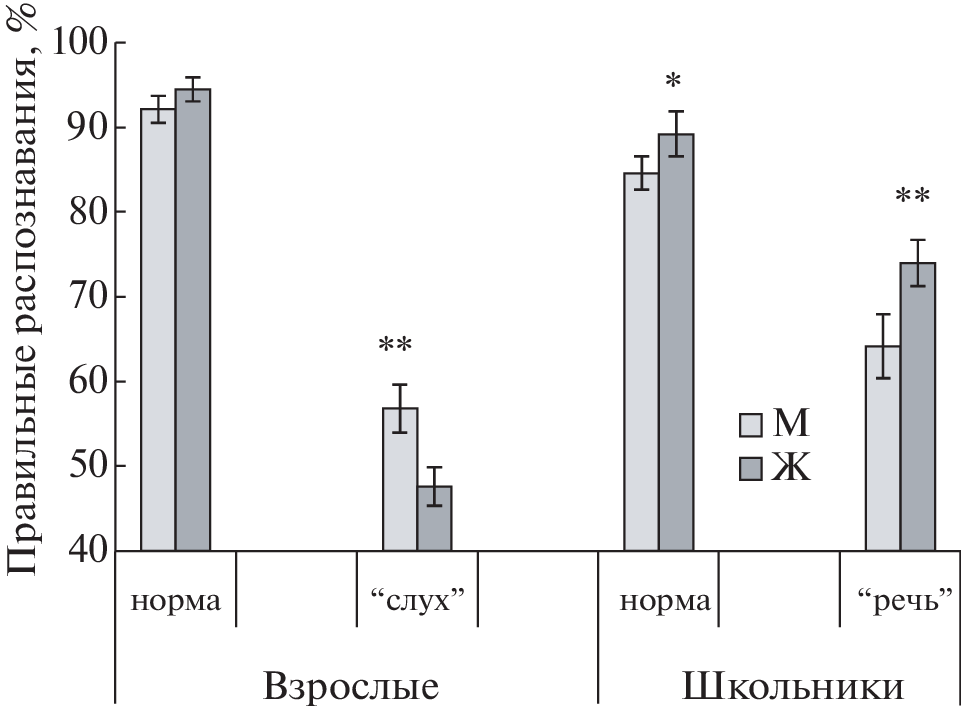 We studied the features of speech signals perception in conditions of vocal competition based on gender (male/female voice) in subjects of different ages and status of auditory and speech functions. Psychophysical measurements were carried out while simulating a “speech cocktail” situation by simultaneously pronounced different words by a male and female. The average fundamental voice frequency for the male speaker was 108 ± 5.92 Hz, for the female speaker – 185 ± 12.03 Hz. Both speakers were standard native speakers of the Russian language. Digital recordings of speech signals were equalized in intensity and compounded so that the total test stimulus was a synchronized mixture of words spoken by a male (M) and female (F) voice. Test speech signals were presented through headphones or through a speaker located in front of the auditor at a distance of 50 cm. The indicators of reaction time and the number of correct recognitions of words of the target speaker (M or F) were compared in 4 groups of subjects of different ages and hearing or speech status: adult subjects with normal hearing and speech (n = 35) and with hearing impaired (n = 26); schoolchildren with normotypical development (n = 26) and with speech disorders (n = 25). The results indicated a falling in the ability to segrerate target speech streams under conditions of vocal competition in the subjects with hearing and speech dysfunctions included in the comparative study. Differences in the perception of male and female voices in subjects with hearing loss and with speech problems were obtained. This result may have a biological and social basis. The data have practical significance for the development of a system of auditory and speech training and modern hearing aid technologies.