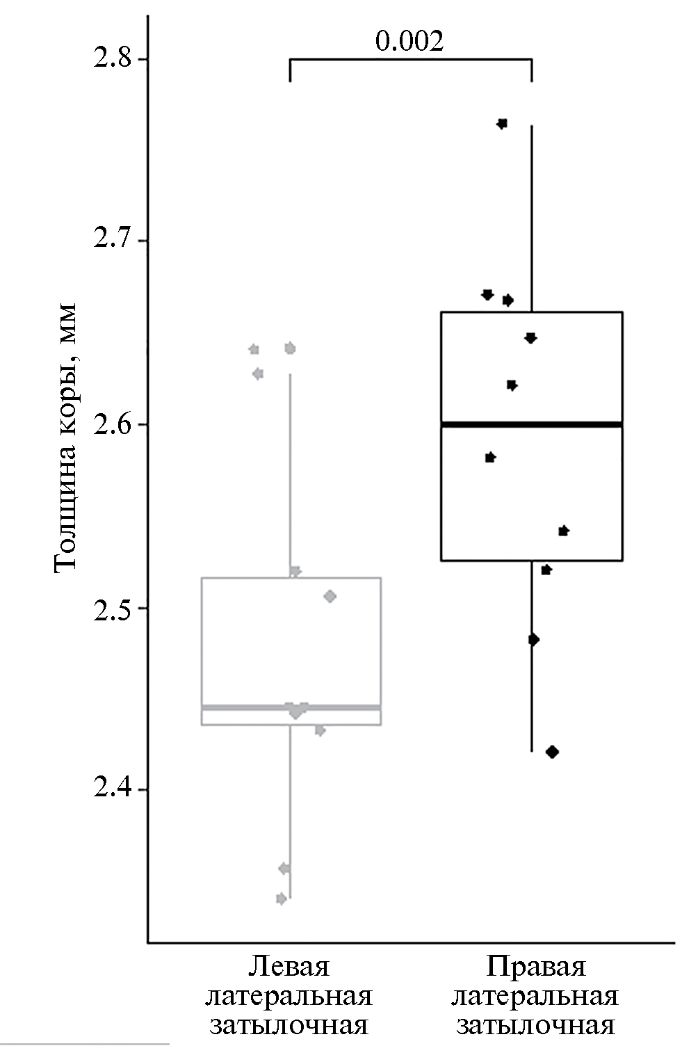 Показатели толщины коры для всех зон интереса представлены в табл. 2. Кроме того, на рис. 2 представлены бокс-плоты показателей толщины затылочной коры для левого и правого полушарий.