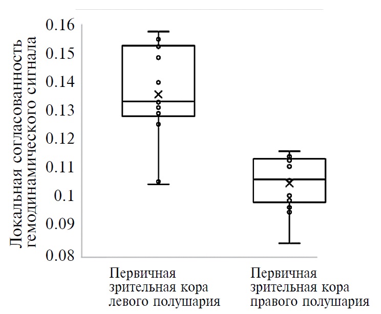 Рис. 3. Бокс-плоты показателей локальной согласованности гемодинамического сигнала в первичной зрительной коре (17-е поле Бродмана) левого и правого полушарий.