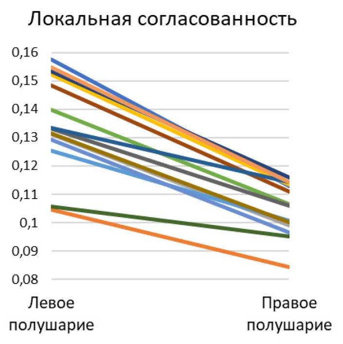 Следует отметить, что показатель локальной согласованности в V1 (17-е поле Бродмана) левого полушария был выше по сравнению с данными для правого полушария не только в среднем, но и у всех без исключения пациентов (табл. 3, рис. 4)