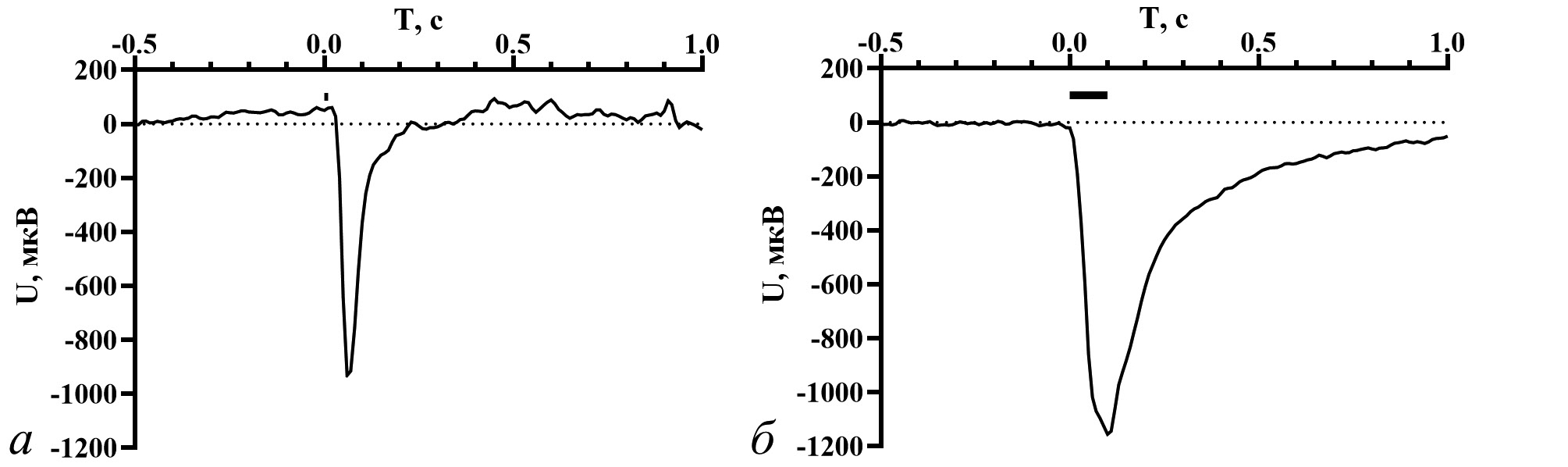 Рис. 1. Оригинальная запись ЭРГ интактного таракана дикого типа. а — таракан № 2 (26.05.2021), ответ на 10 мс вспышку зеленого (525 нм) света средней интенсивности (2.1×108 фотонов/мм2/мс); б — таракан № 8 (19.05.2022), ответ на 100 мс вспышку УФ (365 нм) света высокой интенсивности (1.1×1011 фотонов/мм2/мс). Отметка стимула показана над кривыми. Смещение минимального значения напряжения к концу стимуляции свидетельствует о существенном вкладе фотоэффекта.