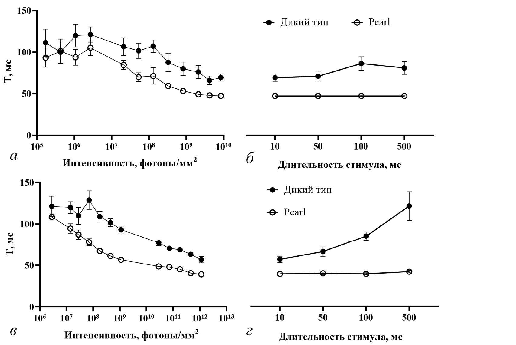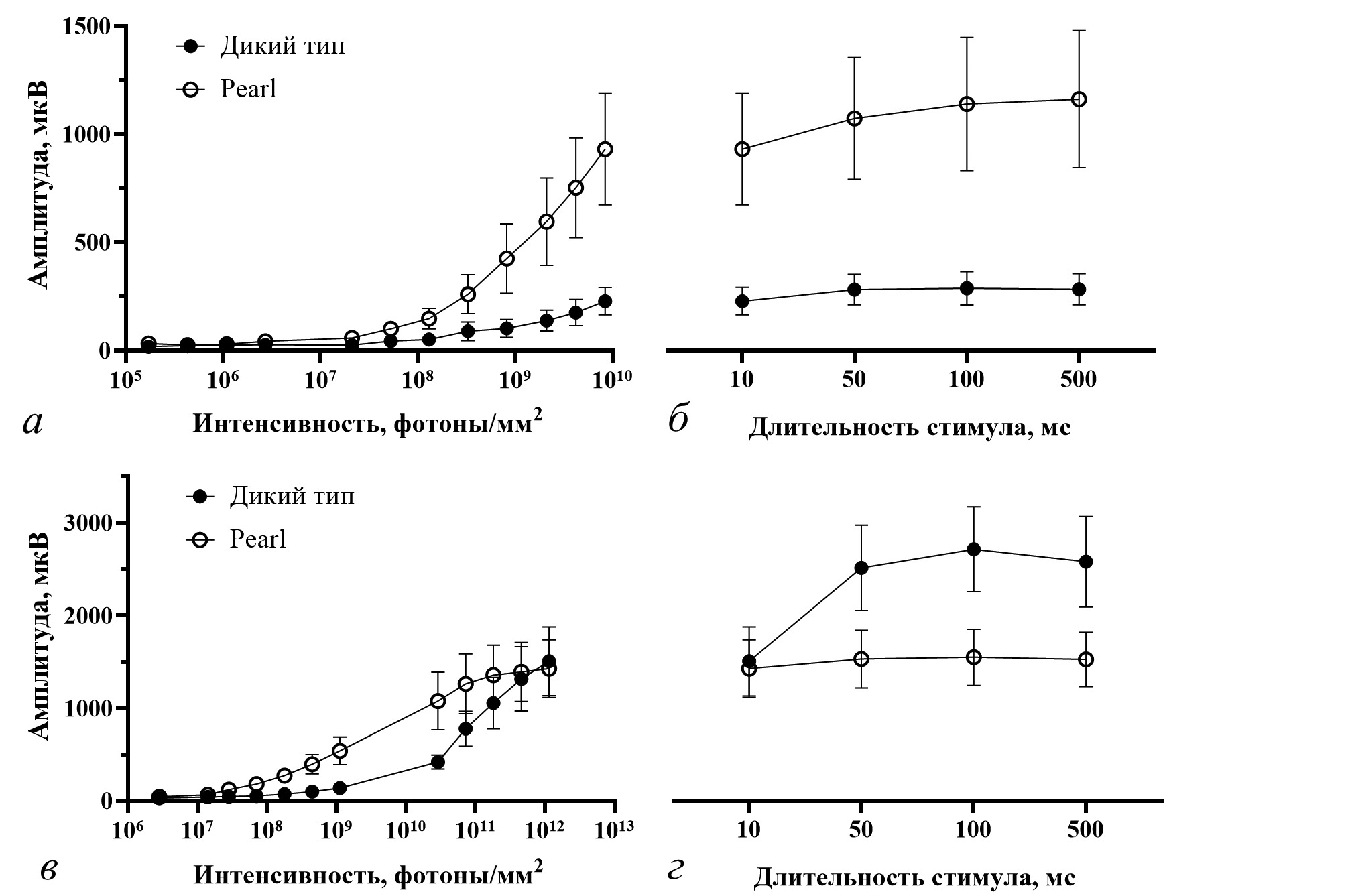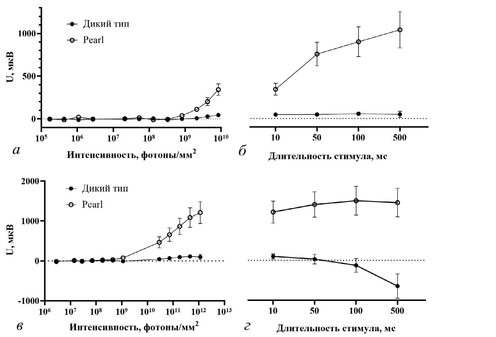 Белоглазые тараканы демонстрировали существенно более высокую чувствительность к свету, а именно ответы, превышающие уровень шума, обнаруживались в ответ на меньшие интенсивности света обеих длин волн, при этом амплитуды ответов были в несколько раз больше, чем у особей дикого типа. Таким образом, полученные данные подтверждают ранее наблюдавшееся кратное увеличение амплитуды ЭРГ у белоглазых мутантов (Gribakin, 1988; Chen et al., 1999). Кажущееся противоречие с данными, полученными при внутриклеточных отведениях (Saari et al., 2018), которые демонстрируют более низкие ответы на свет фоторецепторов из глаз мутантов pearl по сравнению с диким типом, объясняется увеличением потока света, достигающего фоторецепторных мембран и, соответственно, вкладом большего числа фоторецепторов в суммарный электрический ответ глаза.