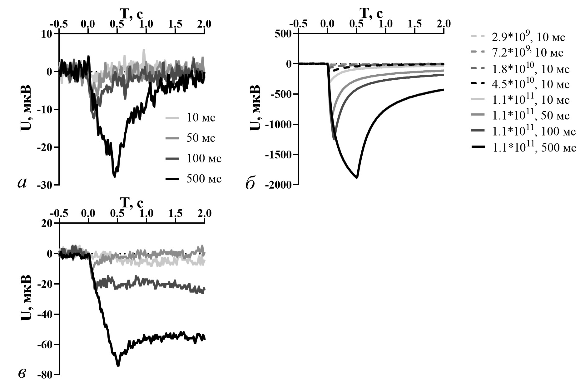Длительность стимула составляла 10 мс для большинства случаев, 1 или 5 мс для УФ-света низкой интенсивности и 50, 100 и 500 мс для максимальной интенсивности. В случае низкой и средней интенсивности стимулы предъявлялись по 10 раз для последующего усреднения, чтобы улучшить соотношение “сигнал–шум”. Стимулы высокой интенсивности предъявлялись меньшее количество раз для снижения влияния световой адаптации на результаты. Интервал между стимулами составлял не менее 15 с.