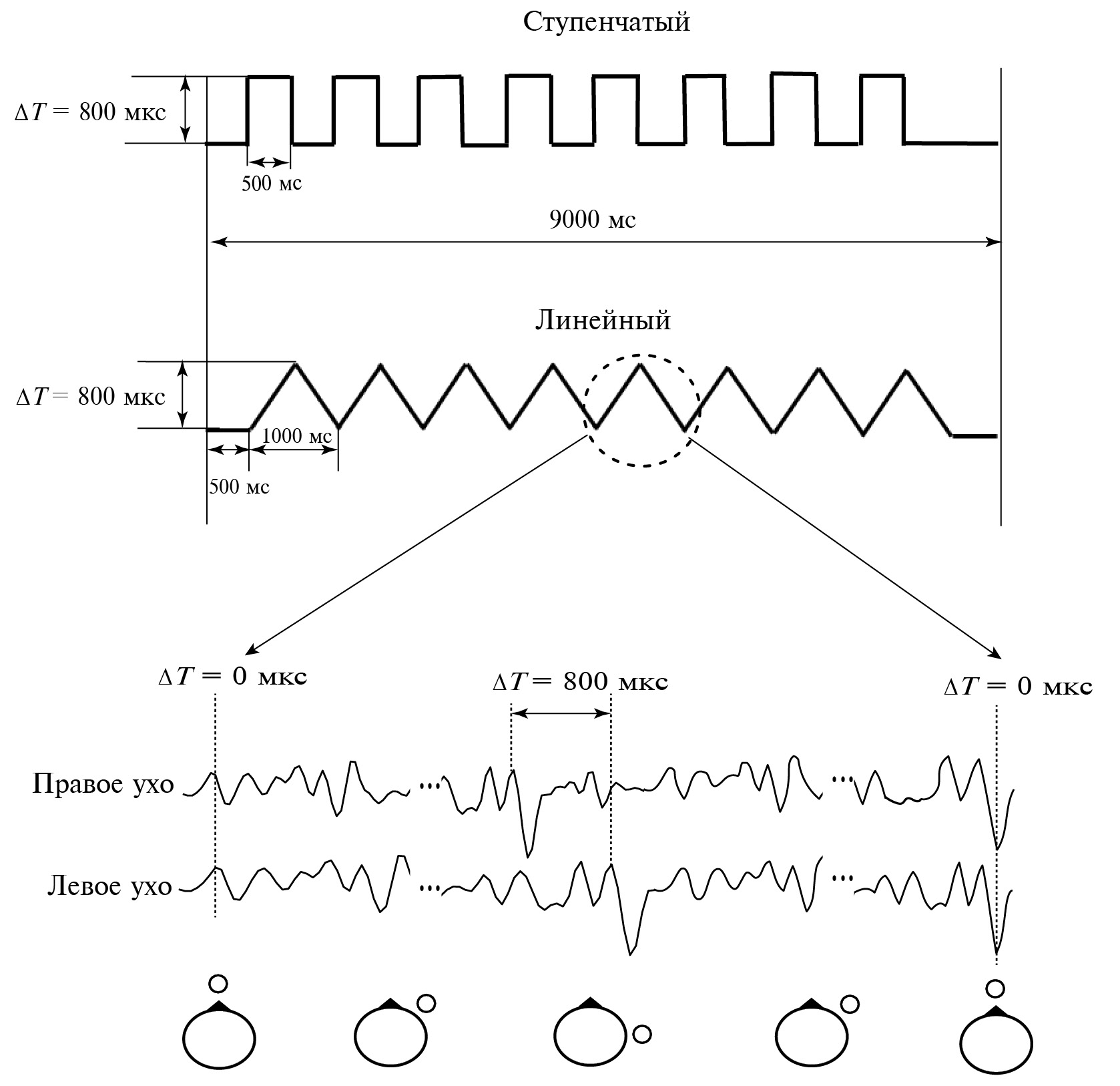 Рис. 1. Изменения величины межушной задержки в бинауральных звуковых стимулах, моделирующих плавное и ступенчатое циклическое движение. Вверху: временная структура стимулов в пределах одной пробы. По горизонтали – время (мс), по вертикали – величина межушной задержки (ΔТ, мкс). Разные начальные значения ΔТ определяют разные положения траекторий циклического движения в субъективном слуховом пространстве. Внизу: схема дихотической стимуляции в одном цикле линейного паттерна (от 0 мкс до 800 мкс и обратно к 0 мкс). На схемах головы условно изображено последовательное изменение положения звукового образа в соответствии с изменениями ΔТ