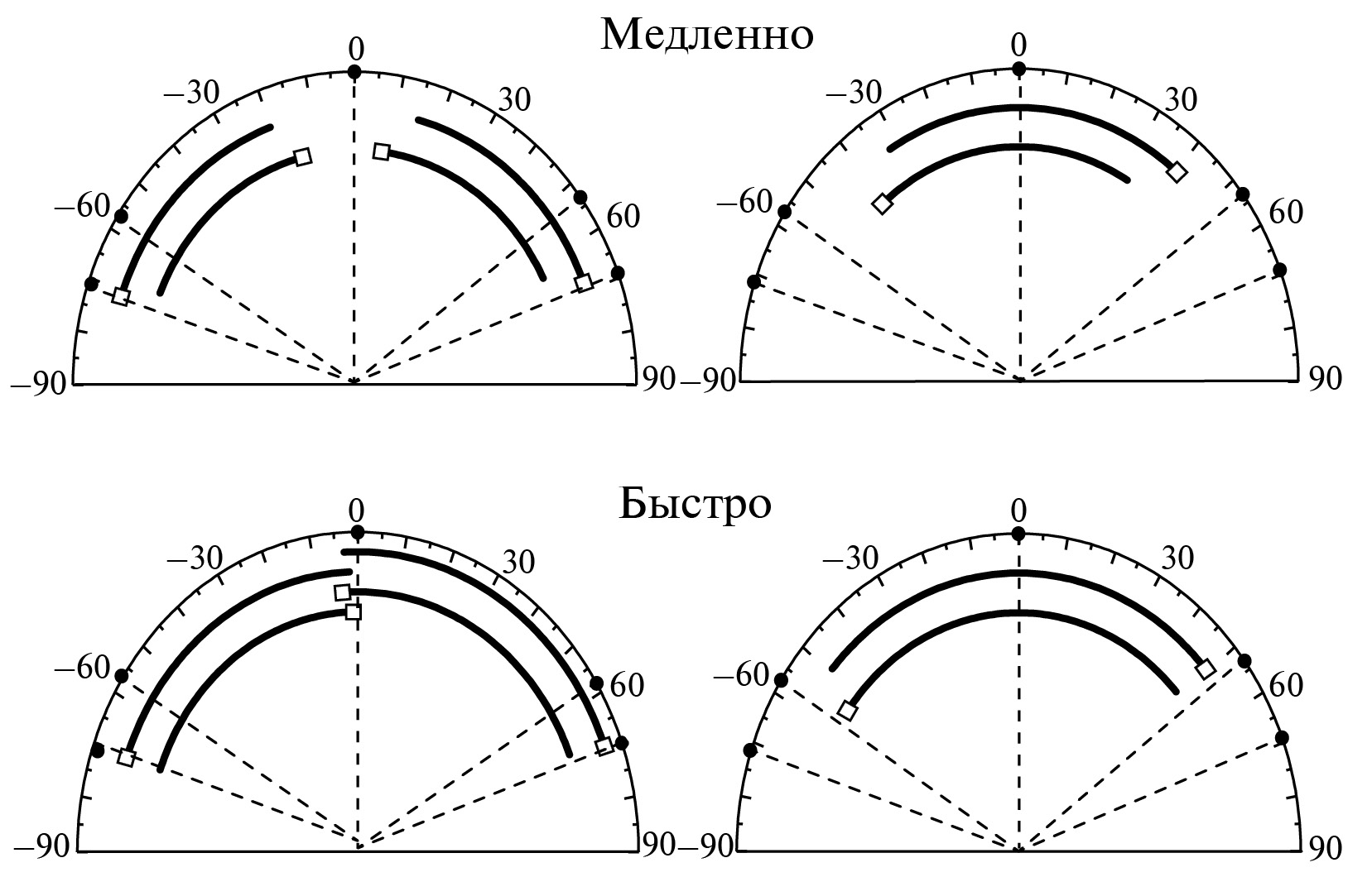 Все слушатели уверенно определяли положение концов траекторий как быстрого, так и медленного движения. Воспринимаемые положения реперов и траекторий движения приведены на рис. 2.