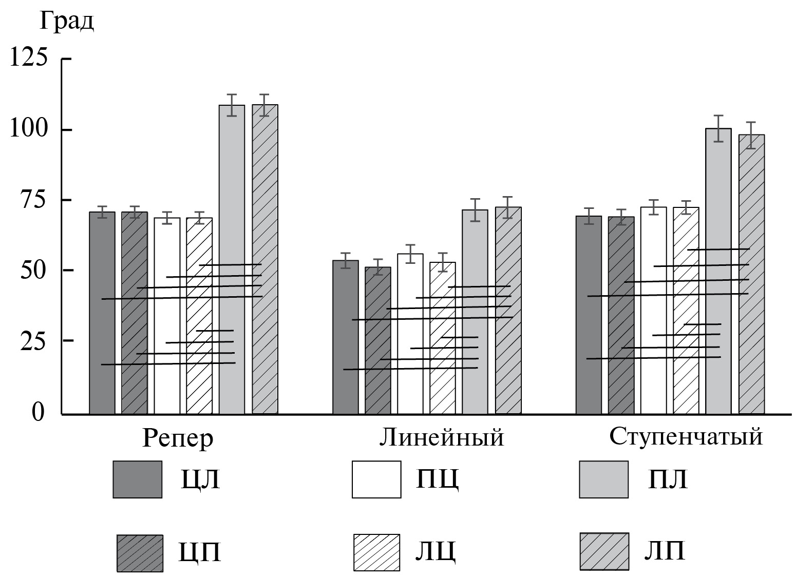 После исключения случайных ошибок каждое индивидуальное значение соответствовало усреднению 20–24 измерений. Измеренные величины подвергали 2-факторному дисперсионному анализу (repeated measures ANOVA, rmANOVA) с факторами Паттерн (репер, линейный, ступенчатый) и Положение (ЦЛ, ЦП, ПЦ, ЛЦ, ПЛ, ЛП). При парных сравнениях по фактору Положение использовали поправку Шидака, а для фактора Паттерн – поправку Бонферрони. Все сравнения проводили с уровнем значимости p < 0.05.