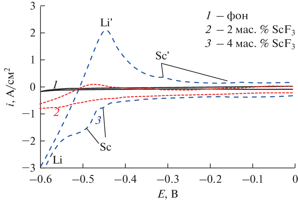 The electrochemical behavior of scandium in halide melts is of interest both from the point of view of developing new electrochemical methods for producing scandium and its materials, and from the point of view of simulating electrochemical behavior of fission products during pyrochemical processing of spent nuclear fuel in molten salts. Using the methods of cyclic voltammetry, square-wave voltammetry and chronopotentiometry, the regularities of electrical reduction of scandium ions depending on the electrolysis parameters of the LiF–CaF2–ScF3 melt at a temperature of 800°C were studied. It is shown that the electrical reduction of scandium in the melt under study occurs at potentials more negative than –0.45 V relative to the potential of the aluminum electrode, while the electrodeposition of scandium on the electrode contributes to the electrical reduction of lithium cations with depolarization. When analyzing the obtained polarization dependences, it was noted that the process of electroreduction of scandium proceeds in one 3-electrode stage, while it is not electrochemically reversible. It has been suggested that the cause of irreversibility is the stage of formation of a new phase. As a result of electrochemical measurements, it was concluded that, due to the wide “electrochemical window”, the LiF–CaF2 melt can be used both for the electrochemical synthesis of scandium and studying regularities of the selective electroreduction or co-electroreduction of minor actinides and lanthanides.