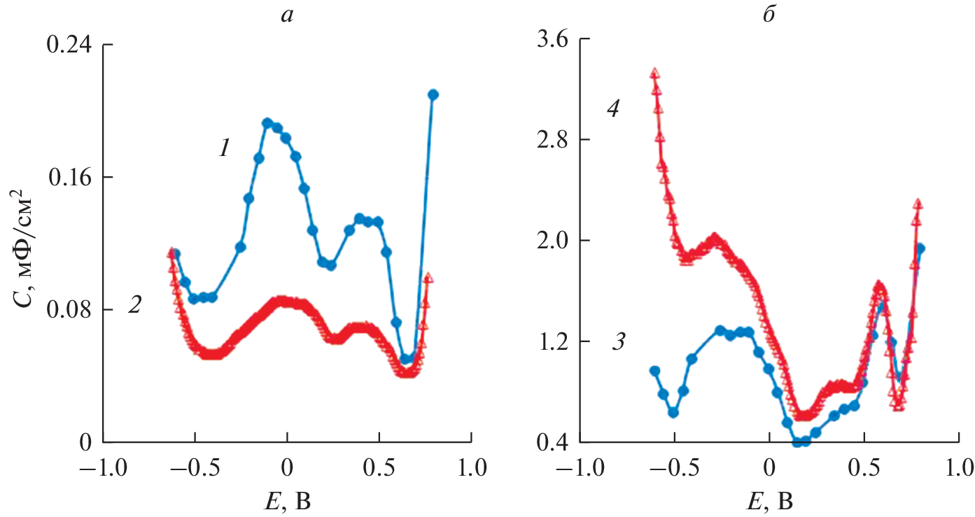 Сapacitance of the iridium electrode was studied by the electrochemical impedance spectroscopy with variation of the main physical and chemical parameters: electrical potential, temperature, radius of the alkali cation. The influence of the signal frequency used in AC electrochemical methods on the capacitance value and the shape of the curve was also checked. Capacitance of the iridium electrode was obtained in molten sodium, potassium and cesium chlorides in the temperature range 1093–1123 K and the frequency range of the AC signal 3 · 100–3 · 104 Hz in the entire accessible range of electrical polarization. The obtained capacitance curves have two main minima with a maximum between them. One of these minima (cathodic one) was identified as the classical potential of minimum capacitance. A decrease in the signal frequency and the temperature of experiment, as well as an increase in the cation radius in the NaCl–KCl–CsCl order, leads to the appearance of one or two additional minima in the potential region between the main minima. The depth of these intermediate minima increases and their potential shifts in the positive direction with an increase in the radius of the alkali metal cation of the salt electrolyte. The calculated values of the capacitance of the electrical double layer and the adsorption capacitance were obtained by the method of equivalent electrical circuits. One of the additional minima obtained by direct measurement of the dependence of the electrode capacitance on the potential at a high AC frequency corresponds to the calculated capacitance of the double layer. The other additional minimum obtained at a low AC frequency corresponds to the calculated adsorption capacitance.