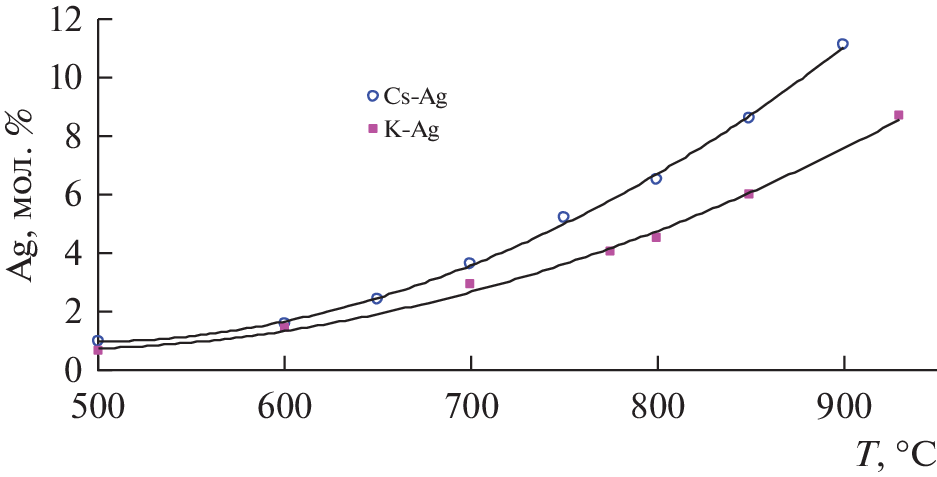 For a number of years, the Institute of High-Temperature Electrochemistry of the Ural Branch of the Russian Academy of Sciences has been determining the solubility of silver depending on temperature both in individual potassium and cesium, and with additions to these alkali metals of their halides. At the beginning of the study, they were assumed to be corrosive due to the prevailing opinion in the literature about the low solubility of silver in potassium and even less in cesium. In this work, it is shown that the solubility of silver in cesium is greater than in potassium. Here are measurements of the solubility of silver in liquid cesium at temperatures from 500 to 900°C. The average value of solubility for each temperature varied from 0.94 to 11.1 mol % Ag, respectively. Experimental data on the solubility of silver in cesium are approximated by a polynomial of the second degree. NAg = 6.066 · 10–5T2 – 5.966 · 10–2T + 15.58, where NAg is silver solubility in mol %, Т is temperature in °C. In this article, using data on the solubility of silver in cesium and the ideal Schroeder solubility equation, the values of the activity coefficients of silver and the partial enthalpy of mixing of silver and its partial excess entropy in these solutions were obtained. They are respectively equal: \({{\overline {\Delta H} }_{{{\text{Ag}}}}}\) = 38 154.8 J/mol and \({{\overline {\Delta S} }_{{{\text{exAg}}}}}\) = 14.215 J/(mol · K). The Schroeder equation was used under the assumption that the enthalpy of silver melting is independent of temperature. The values of the logarithm of the silver activity coefficient versus temperature are approximated by the equation: ln(yAg) = 4589 · 1/T – 1.7097. Approximation error R2 = 0.9818.