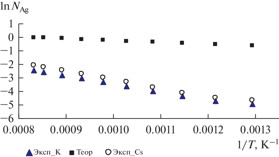 В Институте высокотемпературной электрохимии УрО РАН на протяжении ряда лет проводятся определения растворимости серебра в зависимости от температуры как в индивидуальных калии и цезии, так и с добавками к этим щелочным металлам их галогенидов. В начале исследования предполагались как коррозионные, вследствие сложившегося мнения в литературе о малой растворимости серебра в калии и еще меньшей в цезии. В данной работе показано, что растворимость серебра в цезии больше чем в калии. Здесь представлены измерения растворимости серебра в жидком цезии при температурах от 500 до 900°С. Средняя для каждой температуры величина растворимости изменялась от 0.94 до 11.1 мол. % Ag соответственно. Экспериментальные данные по растворимости серебра в цезии аппроксимированы полиномом второй степени. NAg = 6.066 · 10–5 · T 2 – 5.966 · 10–2 · T + 15.58, где NAg – растворимость серебра в мол. %, Т – температура в °С. В данной статье, используя данные по растворимости серебра в цезии и уравнение идеальной растворимости Шредера, были получены значения коэффициентов активности серебра и парциальные энтальпия смешения серебра и его парциальная избыточная энтропия в данных растворах. Они соответственно равны: \({{\overline {\Delta H} }_{{{\text{Ag}}}}}\) = 38 154.8 Дж/моль и \({{\overline {\Delta S} }_{{{\text{{\и}{з}{б}Ag}}}}}\) = = 14.215 Дж/(моль · К). Уравнение Шредера использовалось в предположении независимости энтальпии плавления серебра от температуры. Значения логарифма коэффициента активности серебра от температуры аппроксимированы уравнением: ln(yAg) = 4589 · 1/T – 1.7097. Погрешность аппроксимации R2 = 0.9818.