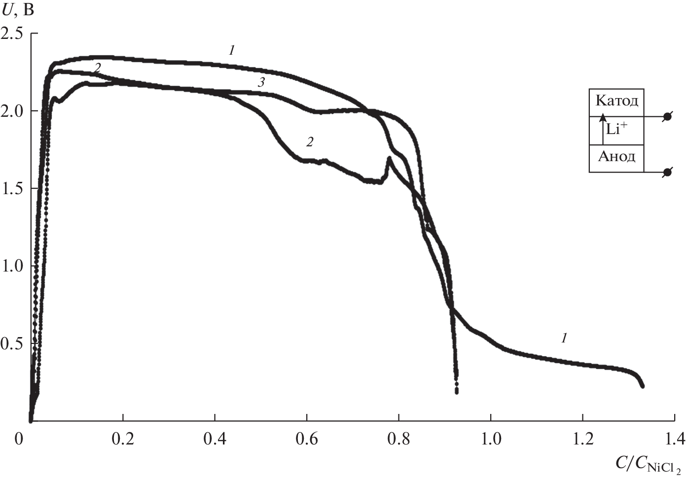 Исследованы разрядные характеристики элементов термоактивируемого химического источника тока (ТХИТ), содержащих в качестве положительного электрода смеси NiCl2–CoF2–MoO3. Установлено, что оксид молибдена стабилизирует разрядное плато и повышает напряжение разряда, при температурах выше 530°С. Разрядная кривая имеет ступенчатый характер. Количество ступеней разрядной кривой определяется условиями работы ТХИТ. Низковольтная ступень (менее 0.4 В), соответствует восстановлению молибдатов лития, которые образуются при взаимодействии оксида молибдена с продуктами восстановления галогенидов переходных металлов. Проведено исследование продуктов восстановления катодной смеси методами РФА, СТА и РЭМ. Установлено, что в процессе разряда элемента ТХИТ происходит восстановление исходных компонентов катодной смеси до металлов, которые формируют дендритную матрицу. ДСК кривые солевой фракции, образующейся в процессе электрохимических реакций, имеют ряд термоэффектов, соответствующих температурам совместного плавления тройной смеси галогенидов лития LiF–LiCl–LiBr и эвтектик двойных систем LiF–LiCl, LiCl–Li2O, в которых растворены галогениды переходных металлов и молибдаты лития.