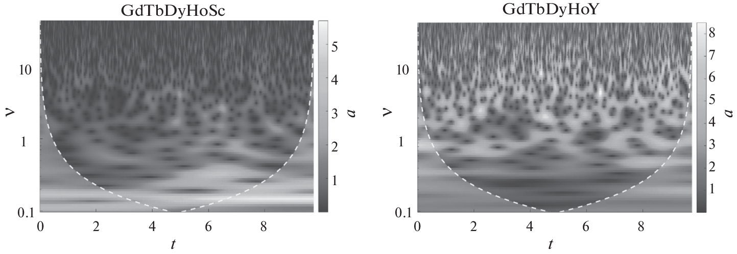 The corrosion behavior of disordered systems, such as high-entropy alloys, exhibit a stochastic random process. To accurately predict and analyze the behavior of these systems in service environments, it is necessary to employ new computational and experimental methods alongside classical electrochemical methods. In this study, we highlighted the effectiveness of using fast Fourier transform and wavelet analysis to assess the corrosion behavior of stochastic systems, using the example of equimolar rare-earth alloys GdTbDyHoSc and GdTbDyHoY. To evaluate the corrosion behavior, we measured the time series of potential fluctuations for the studied samples in a 0.01 M NaCl solution over a 12-hour period, at current densities ranging from 0.2 to 0.5 mA/cm2. Applying the fast Fourier transform method to analyze the obtained time series, we observed that the angular coefficient of the slope of the logarithm of the power spectral density logarithm to the logarithm of frequency increased with higher current density. Specifically, for the GdTbDyHoSc alloy, the coefficient increased from –1.46 to –1.35, indicating the prevalence of general corrosion dissolution. In contrast, for the GdTbDyHoY alloy, the coefficient increased from –1.93 to –1.77, suggesting the dominance of localized dissolution. Furthermore, we utilized wavelet analysis to process the time series data for both alloys at current densities ranging from 0.2 to 0.5 mA/cm2. This analysis allowed us to plot time series scalograms, which visually illustrated the intensity of the corrosion process on the surface of the investigated alloys. From the scalograms, we calculated the values of the global energy spectra distributed over frequency ranges, as well as the values of the total energy of the investigated systems. Interestingly, the GdTbDyHoY alloy exhibited higher total energy values compared to the GdTbDyHoSc alloy. Specifically, the total energy for the GdTbDyHoY alloy increased from 0.97 to 2.03 kV2 as the current density increased from 0.2 to 0.5 mA/cm2, respectively. For the GdTbDyHoSc alloy, the total energy increased from 0.50 to 0.84 kV2. In conclusion, the application of fast Fourier transform and wavelet analysis methods proved to be effective tools for gaining a deep understanding of the corrosion behavior of locally disordered chemical systems, such as the high-entropy alloys of GdTbDyHoSc and GdTbDyHoY composition.