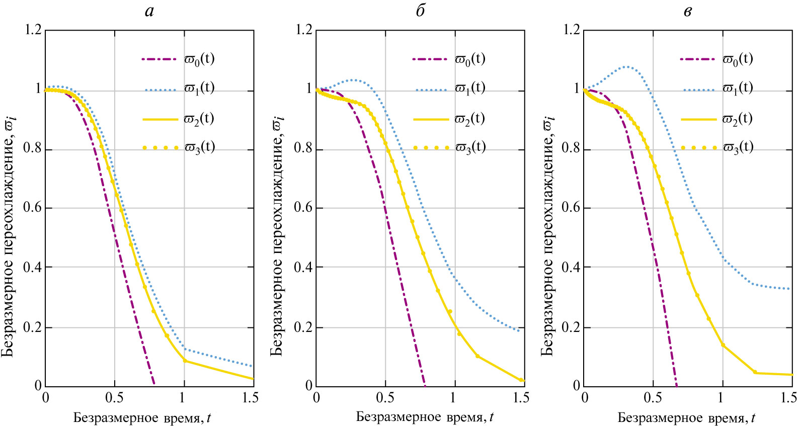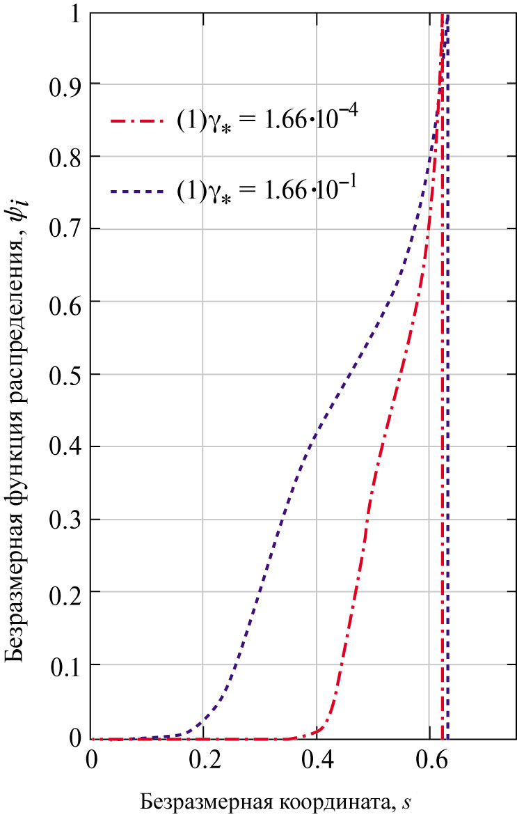 Здесь t и s — безразмерные временная и пространственная переменные, ϖ — безразмерное переохлаждение, Ψ — безразмерная функция распределения частиц по радиусу, τ и l0 — характерные масштабы времени и длины, а безразмерные параметры b1 и описывают соответственно эффекты скрытой теплоты кристаллизации и поверхностного натяжения.