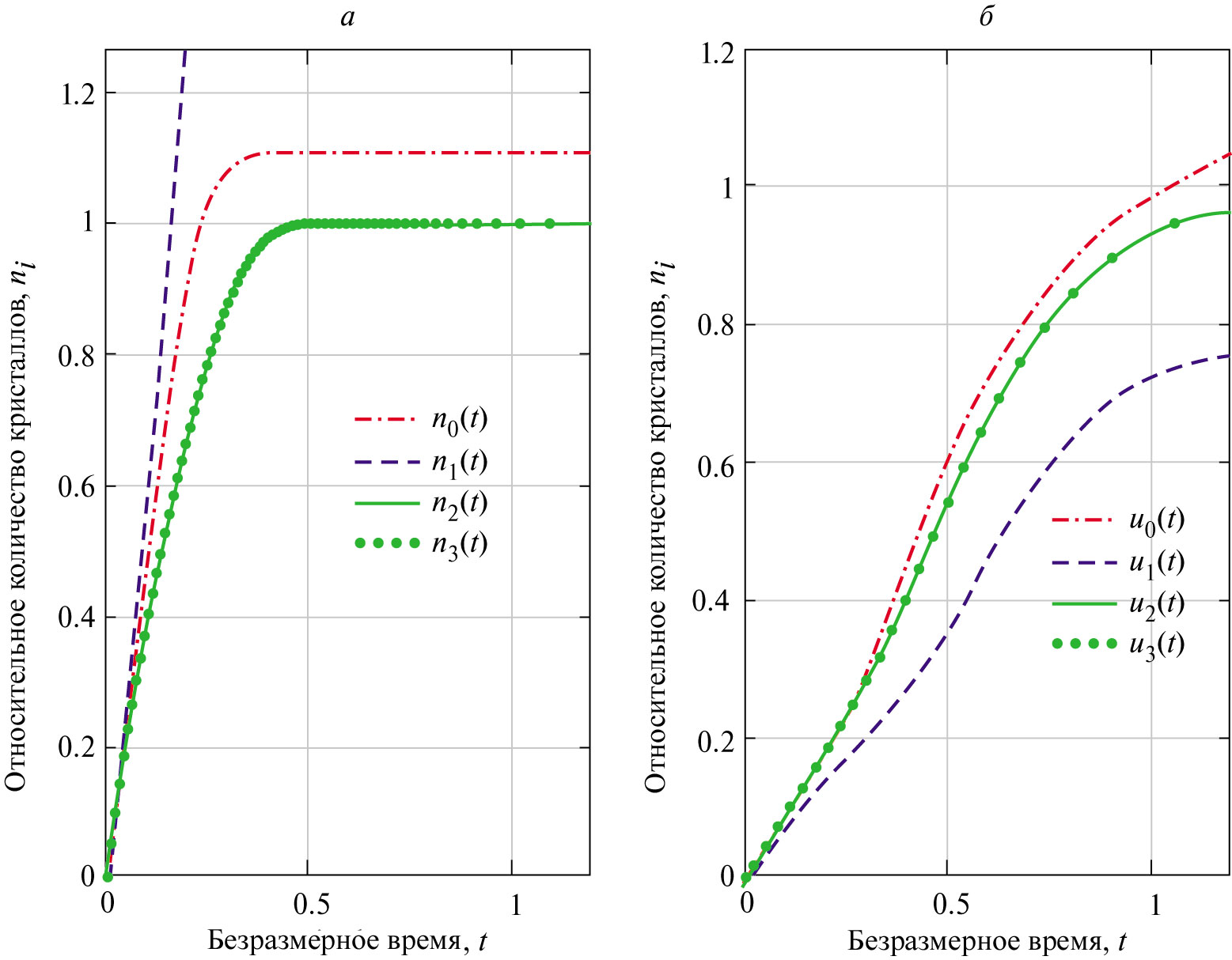 Рис. 5. Относительное количество кристаллов nᵢ = Nᵢ(x₁)/N₃(x*) (a) и их средний радиус uᵢ = L̅ᵢ(x₁)/L̅₃(x*) (б) в зависимости от безразмерного времени t = τ/τ₀ для кинетики нуклеации WVFZ, ∆i₀ = 573K , p = 7.4 . Здесь нижний индекс “*” обозначает полностью переохлажденное состояние жидкости (ϖ = 0, x* = 0.742, t* = 2.038).
