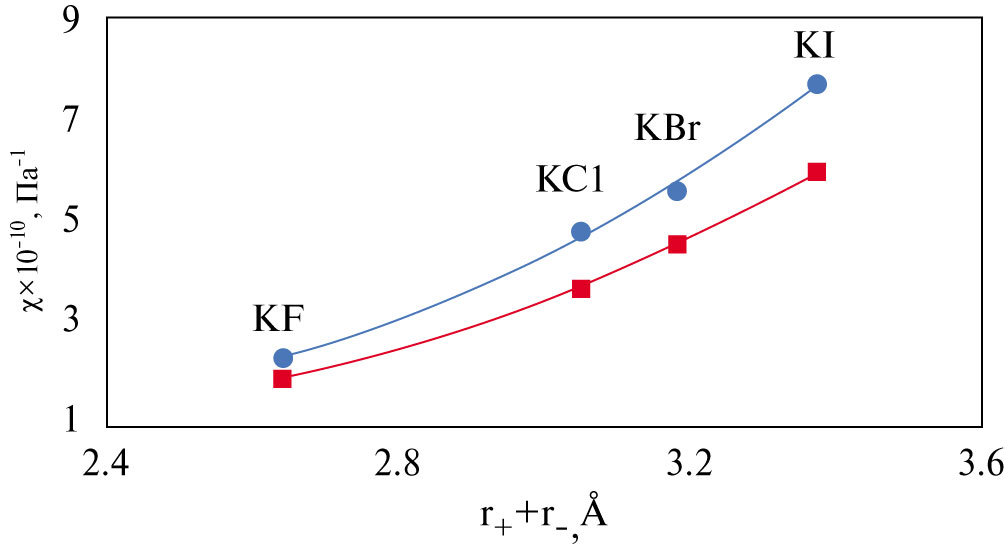 На рис. 1 приведены результаты расчета изотермической сжимаемости для индивидуальных галогенидов калия в зависимости от суммы радиусов катиона и аниона соли. Чтобы перейти к сопоставлению с литературными данными, необходимо пересчитать величину адиабатической сжимаемости ᵡs, которая приводится в монографии [6] и напрямую связана с измеряемой скоростью звука, на изотермическую сжимаемость по выражению .