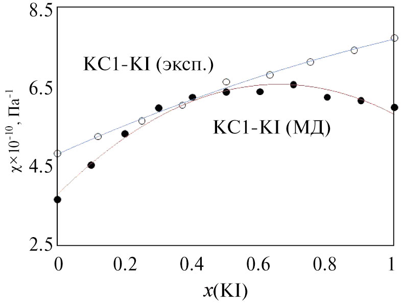 Моделирование бинарных смесей проводилось на всем интервале концентраций с шагов в 10-мольных процентов при температуре 1 200 К. Полученные в результате расчетов величины изотермической сжимаемости приведены на рис. 2 в сопоставлении с экспериментальными данными.