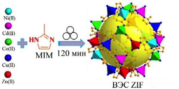 Рис. 3. Схема синтеза гибридных НЧ-ВЭС. Конечный высокопористый НЧ-ВЭС состоит из металлических кластеров и органических мостиковых лигандов на цеолит-имидазолатном каркасе с большим количеством активных метало-органических центров (MIM – 2-метилимидазол) [69].