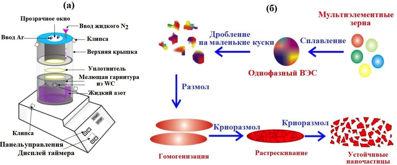 Рис. 4. (а) Схема одношаровой вибрационной криомельницы, изготовленной по индивидуальному заказу; (б) схема формирования НЧ-ВЭС в криогенной мельнице [71].