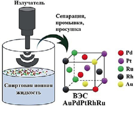 Рис. 8. Схема синтеза нанокатализаторов на основе ВЭС с помощью «мокрой» химии с применением УЗ и спиртовой ионной жидкости [86].
