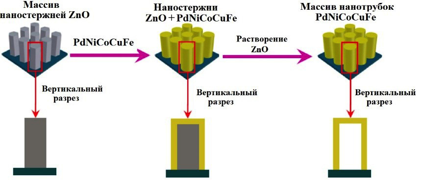 Массивы нанотрубок из пятикомпонентного сплава PdNiCoCuFe методом темплатного электроосаждения были получены Wang с сотр. [89]. Синтез включал 3 стадии: 1) электроосаждение ZnO на титановую подложку в растворе нитрата цинка и нитрата аммония (создания массива наностержней ZnO), электроосаждение сплава PdNiCoCuFe из хлоридов Pd, Fe, Co, Cu и Ni на поверхность наностержней; 3) растворение наностержней ZnO в растворе щелочи NaOH (рис. 9). Внутренний диаметр, толщина стенок и длина полученных нанотрубок сплава PdNiCoCuFe составили 300–400 нм, 150 нм и 1.8 мкм соответственно. Нанотрубки показали превосходную каталитическую активность и долговременную стабильность цикла электроокисления метанола, что было объяснено с точки зрения синергетического эффекта ВЭС [89].