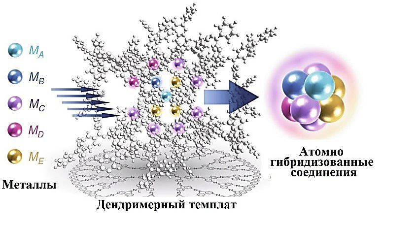 Tzukamoto и др. [91] использовали в качестве темплатафенилазометиновый дендример для получения «субнанокластеров» ВЭС состава Ga1In1Au3Bi2Sn6. Соли металлов (GaCl3, InBr3, AuCl3, BiCl3, SnBr2) осаждались на иминных центрах дендримера PyTPM-G4 с образованием комплекса дендримера с пятью солями металлов (GaCl3)1(InBr3)1(AuCl3)3(BiCl3)2(SnBr2)6@PyTPM-G4, а затем восстанавливались с помощью NaBH4 (рис. 10). В результате были получены «субнанокластеры» размером ~ 1 нм. Авторы подчеркивают, что матрица дендримера способствует синтезу многокомпонентых субнанокластеров, позволяет контролировать их размер и подавляет агрегацию. Анализ энергии связи элементов методом рентгеновской фотоэлектронной спектроскопии (РФЭС) позволил сделать вывод о наличии гибридизации атомных орбиталей, что, по мнению авторов, делает возможным синтез мультикомпонентных сплавов.