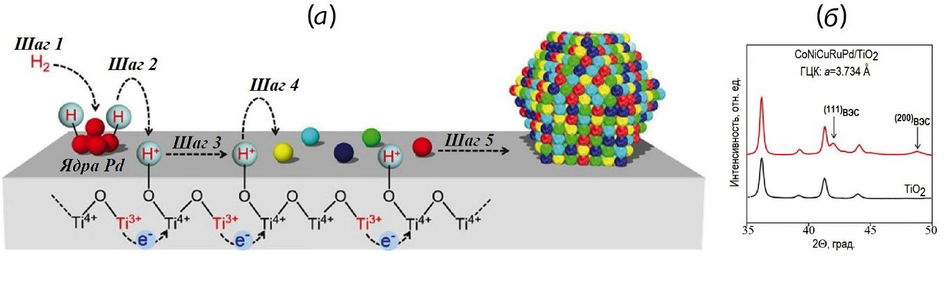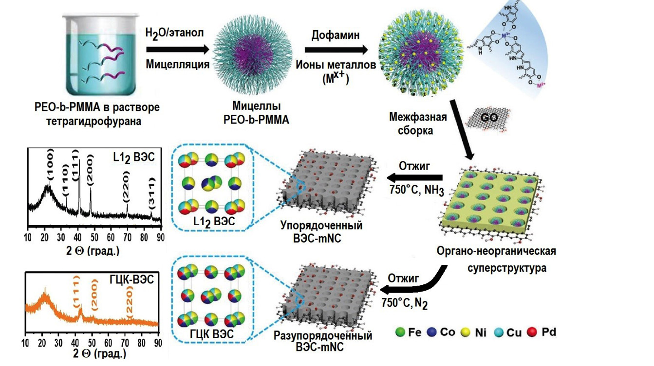 В раствор диблок-сополимеров PEO-b-PMMA (polyethyleneoxide-b-polymethylmethacrylate, полиэтиленоксид-полиметилметакрила) в тетрагидрофуране при добавлении H2O и этанола, происходило образование мицелл PEO-b-PMMA; в этот же раствор добавляли дофамин и соли металлов, которые реагировали между собой с образованием комплѐкса Me-катехоламин (metal–catecholamine, MС); в результате взаимодействия между мицеллами PEO-b-PMMA и MС образовался композита MC/PEO-b-PMMA. Затем этот композит осаждали на листах оксида графена (ГО). При этом частицы композита не только закрепились на поверхности ГО за счет электростатического притяжения, но и продолжили рост вокруг мономицелл образуя непрерывную сеть на поверхности ГО. После отжига полученного слоистого материала в атмосфере NH3 или N2 при температуре 750оС авторы наблюдали наночастицы ВЭС FeCoNiCuPd на двумерном мезопористом углеродном сэндвич-каркасе, обогащенном азотом. Интересно, что ВЭС с неупорядоченной ГЦК-фазой формировалсяпри отжиге в атмосфере N2. При отжиге в атмосфере аммиака на поверхности углеродных нанолистов формировался упорядоченный ВЭС со сверхструктурой L12. Анализ показал, что в этой фазе упорядочиваются атомы Fe, Co, Pd и Cu, в то время как атомы Ni распределены по всей решетке случайным образом. Исследования каталитического восстановления кислорода показали, что наночастицы с упорядоченным ВЭС демонстрируют значительно улучшенные каталитические характеристики, высокую долговечность по сравнению с неупорядоченным ВЭС и коммерческие катализаторы Pt/C.