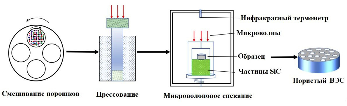 Микроволновой (МК) нагрев – это нагрев материала за счет преобразования электромагнитной энергии в тепловую, в результате которого порошки уплотняются и спекаются с получением сплавов. По сравнению с традиционным спеканием метод МК спекания обладает многими преимуществами, такими как низкое энергопотребление, высокая скорость нагрева, короткое время спекания (в том числе за счет улучшения процессов диффузии элементов), замедленный рост зерен.