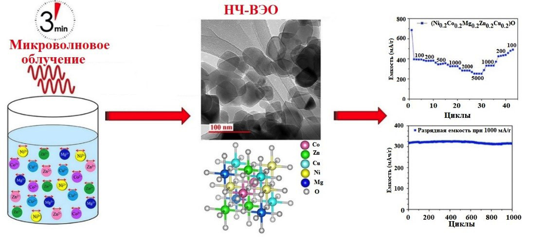 Синтез оксида (Mg, Cu, Ni, Co, Zn)O [98] и антимонида NiCoFeZnSb [99] выполняли спеканием прекурсоров (нитраты, тригидраты, хлориды) растворенных в этаноле или деионизированной воде, в микроволновой печи при мощности 850–1000 Вт в течение 3 минут (рис. 13). Высокоэнтропийный оксид имел структуру каменной соли со средним размером частиц 44 нм [98]. Он продемонстрировал замечательную обратимую емкость более 250 мА/г при плотности тока 5 А/г и превосходное сохранение емкости более 98% после 1000 циклов при 1 А/г [98]. Антимонид NiCoFeZnSb имел гексагональную структуру P63/mmc с размером зерна 10–100 нм [99]. Его емкость составила 1850 Кл/г, а долговечность цикла – 82.0% после 10 000 циклов.