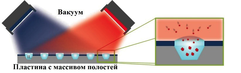Рис. 14. Слева: схема комбинаторного совместного осаждения из двух распыляемых мишеней на подложку с массивом полостей, заполненных ионной жидкостью (ИЖ). Справа: Схема предполагаемого процесса формирования НЧ в ИЖ [102].