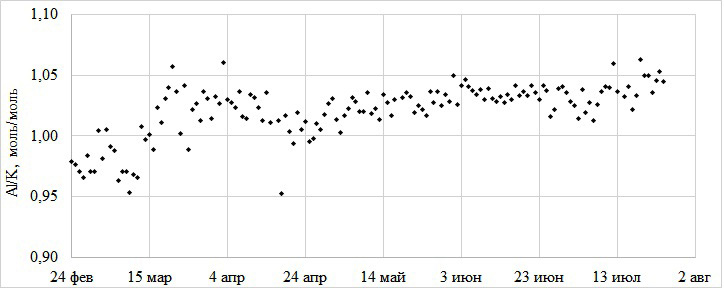 Рис. 1. Динамика изменения мольного соотношения Al/K в расплаве KCl–AlCl3–ZrCl4–HfCl4 установки разделения хлоридов циркония и гафния АО ЧМЗ в процессе эксплуатации.